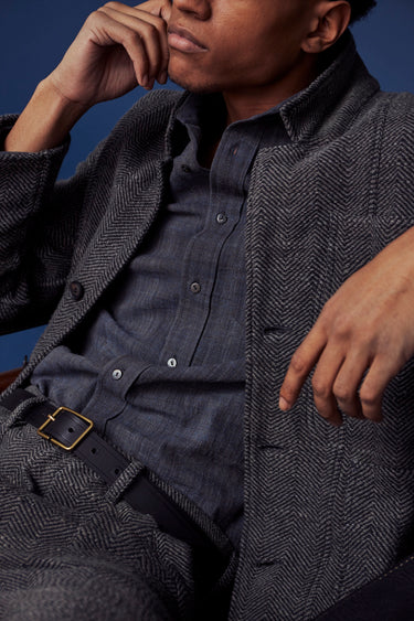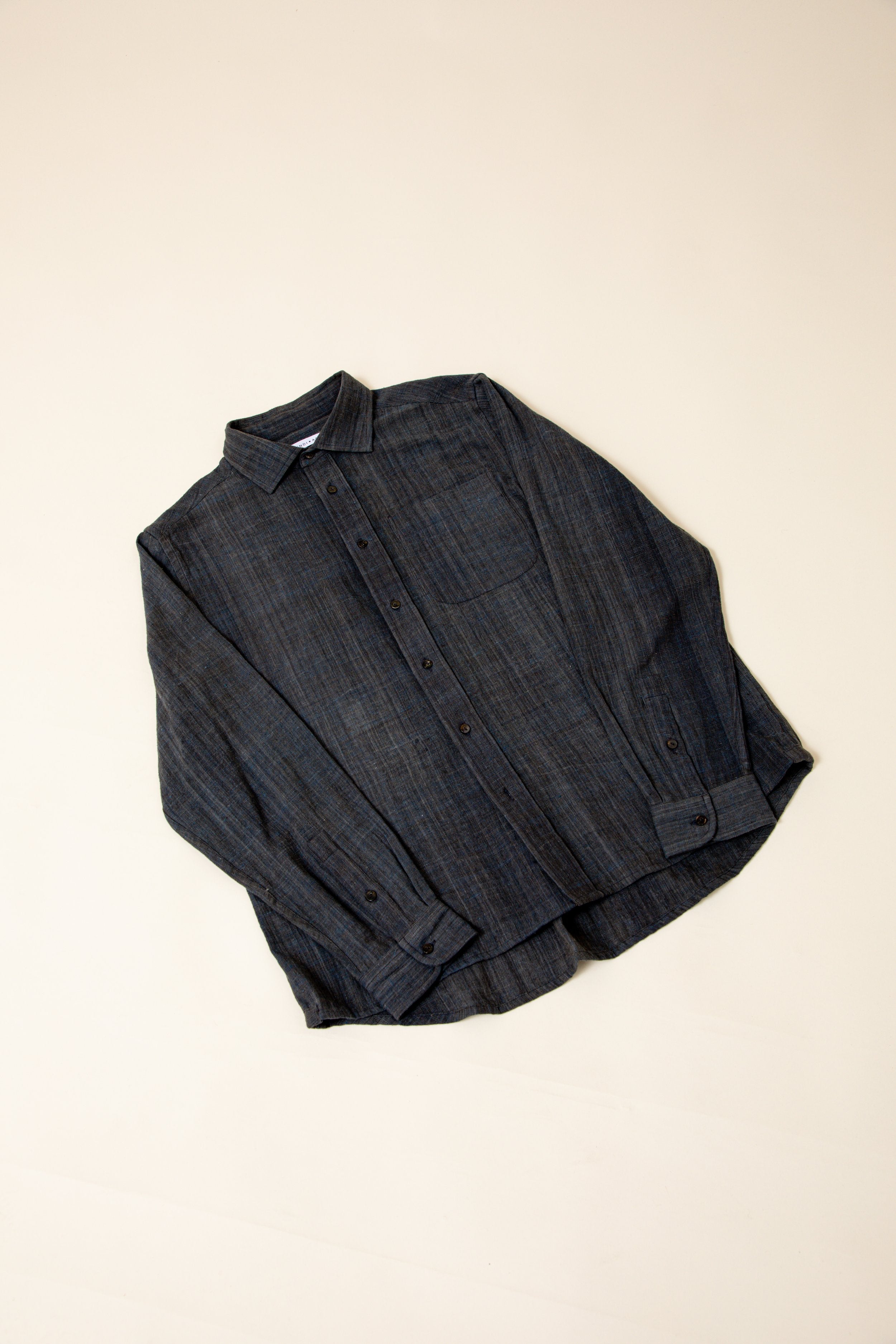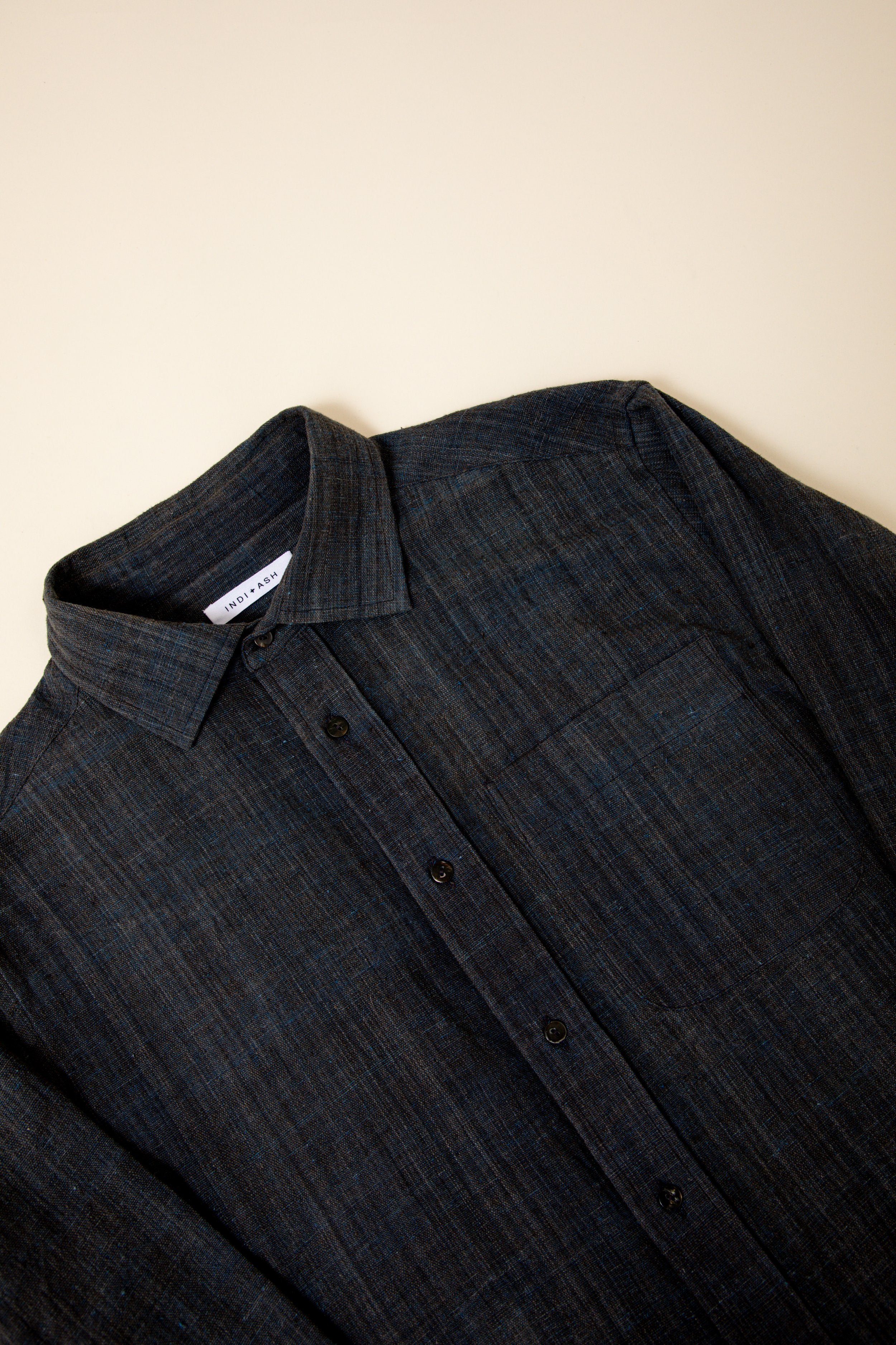 Our Core Matty Shirt in our classic handwoven kala cotton. Wild growing, naturally organic, warp yarns hand dyed black in an iron vat, crossed with weft yarns that have been hand dyed with plant based indigo. The fabric has been pre-washed and has a baked in gentle rumple. A wonderfully textured lightweight seasonless textile.
