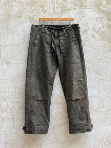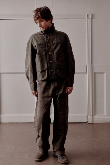 A rugged workwear addition to the collection. Organic cotton millwoven canvas with special new technique developments. Iron brown and forest green colorways are washed in a manually operated enzyme stone barrel, creating a crackle effect which highlights some of the dyes undertones.