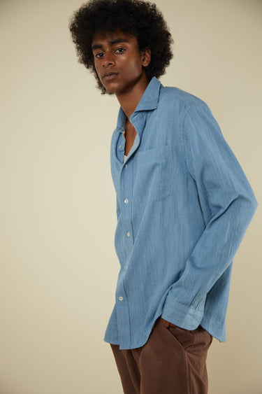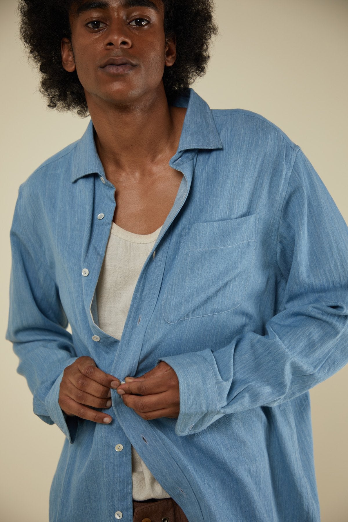 Our Core Matty Shirt in a newly developed light weight denim. A fine twill weave, with weft yarns dyed with natural indigo for a pale blue dress shirt - the fabric has been pre-washed and has a soft drape. A wonderfully textured lightweight seasonless textile.