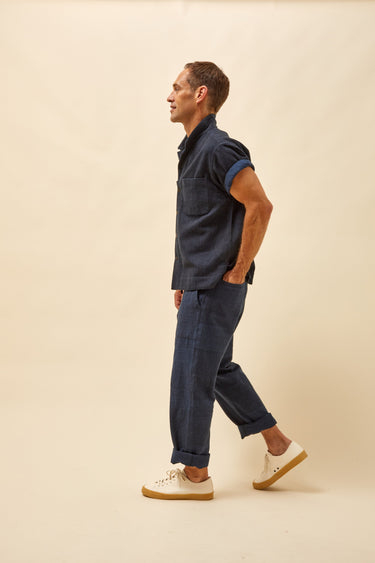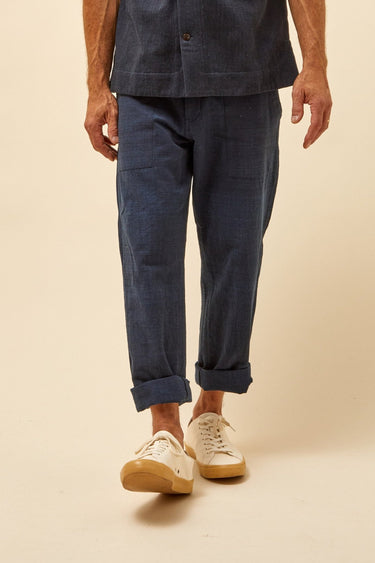 The Obelisk pant is inspired by vintage USMC military pants, and is the perfect relaxed silhouette for Spring and Summer. This issue is in our new iron and indigo powerloom canvas. An iron dyed warp and plant indigo weft in the plain weave cause the colors to blend creating a rich deep indigo hue with hints of black.