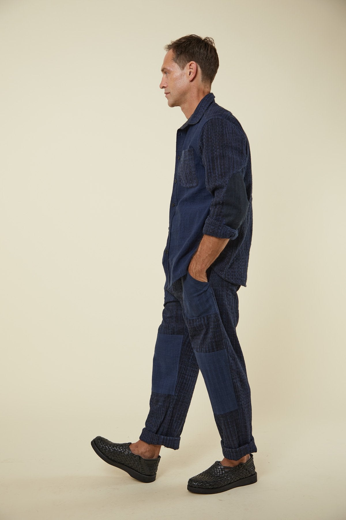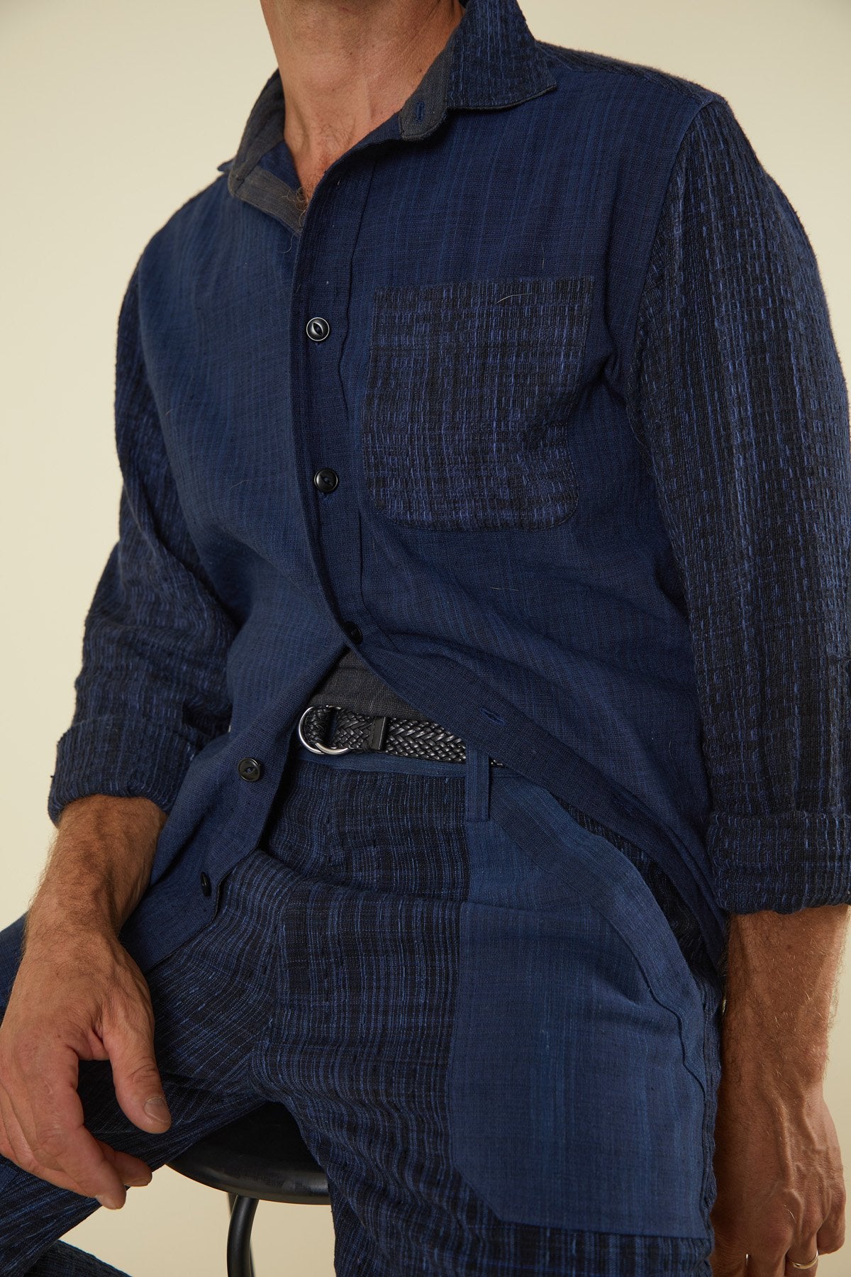 Our classic fitting Matty shirt has been upgraded to a patchwork overshirt with the additions of a heavy contrast interior back yoke and interior collarstand, elbow patches and heavy duty gussets. A mix of many of the fabrics in our collection have been used for subtle and tonal detailing throughout the shirt, single tailor construction finished with french seams, and built to last. The perfect texture for all year round.