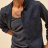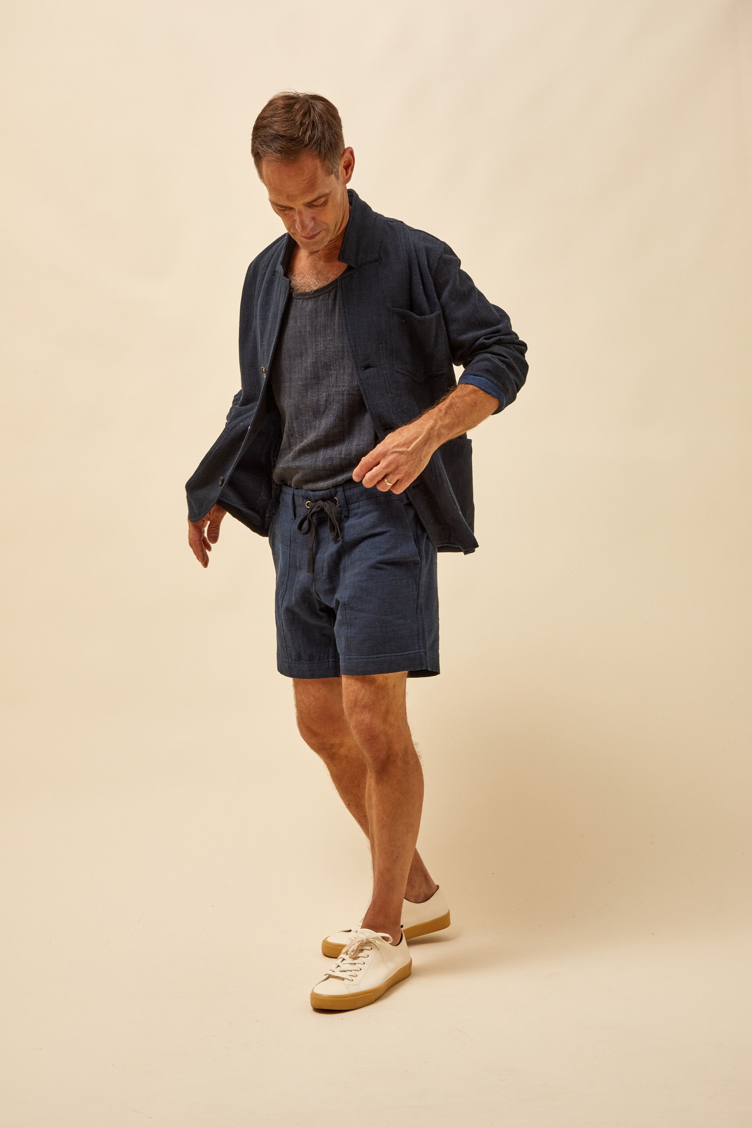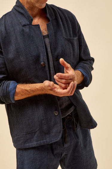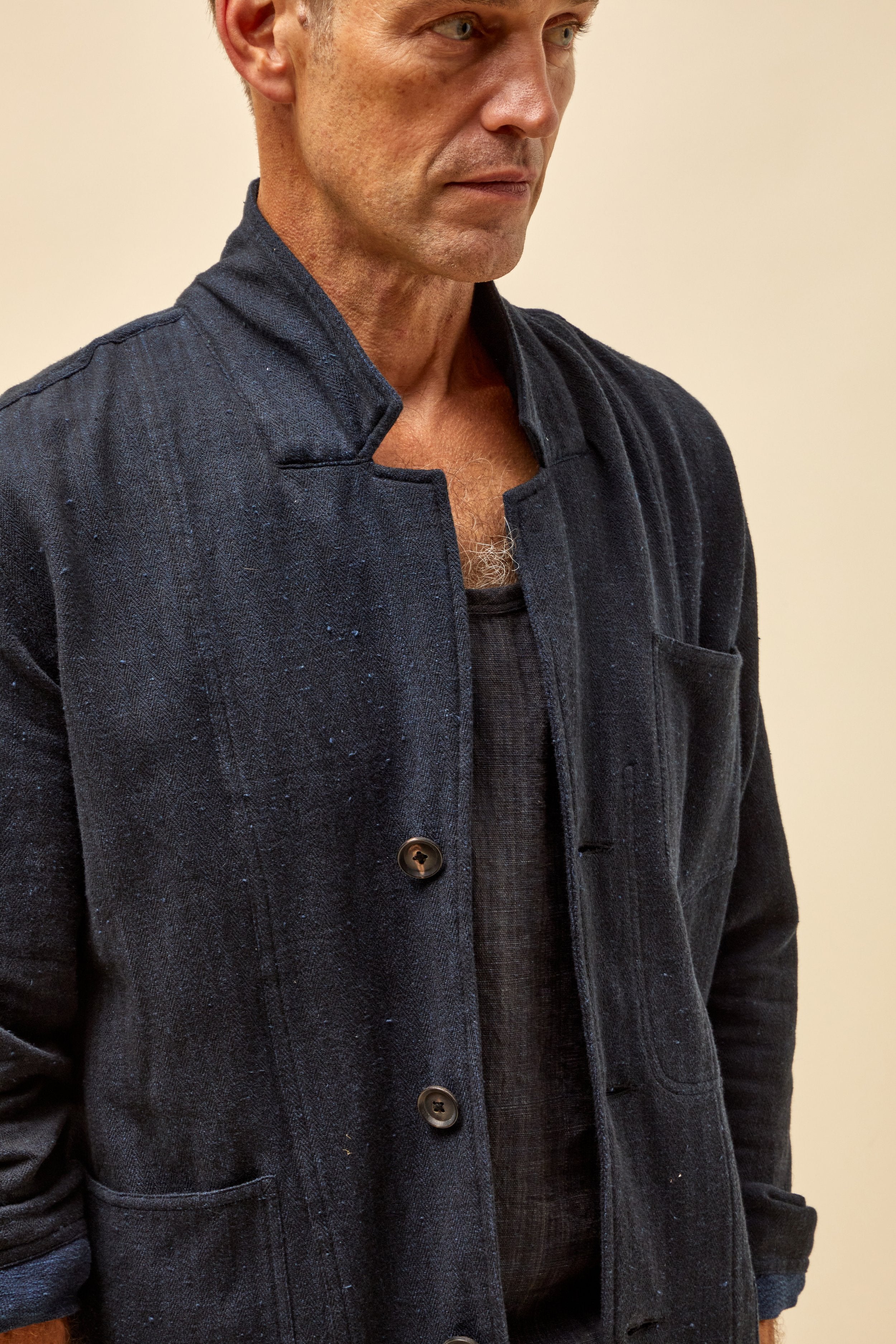 Inspired by vintage French chore coats, The Study Coat is unconstructed, with patch pockets at the exterior and interior, and a slightly dropped, modern notch lapel. . A boxy, straight fit, with slightly shorter sleeves. Finished with flat felled and french seams, its so clean you can wear it inside out.