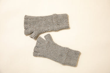Hand knit from all our best sweater yarns. Fingerless, one size fits all, with a racking stitch at the wrist for ease of movement. Pictured here in our undyed grey baby alpaca and walnut dyed Peruvian Pima Cotton combo.