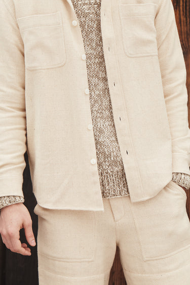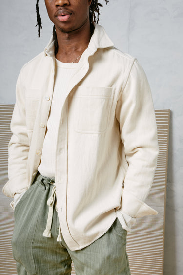 Undyed yarns woven in a classic 2X1, dense enough to last forever, but soft and drapey enough to wear everyday. Classic workshirt details inspired by old Big Mac workshirts, in a slightly oversized fit so it can be layered and worn like a jacket. Single Tailor Construction. Mother of Pearl fisheye buttons provide a natural twist on a classic detail. Kala Cotton gussets at the sideseam and interior placket. Machine wash cold and hang dry.