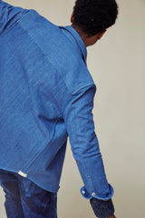 Classic workshirt details inspired by old Big Mac workshirts, in a slightly oversized fit so it can be layered and worn like a jacket. Rivershell flying saucer buttons provide a natural twist on a classic detail. Kala Cotton gussets at the side seam with hand embroidery. Brandon is 6'2" and wearing the sz 3.