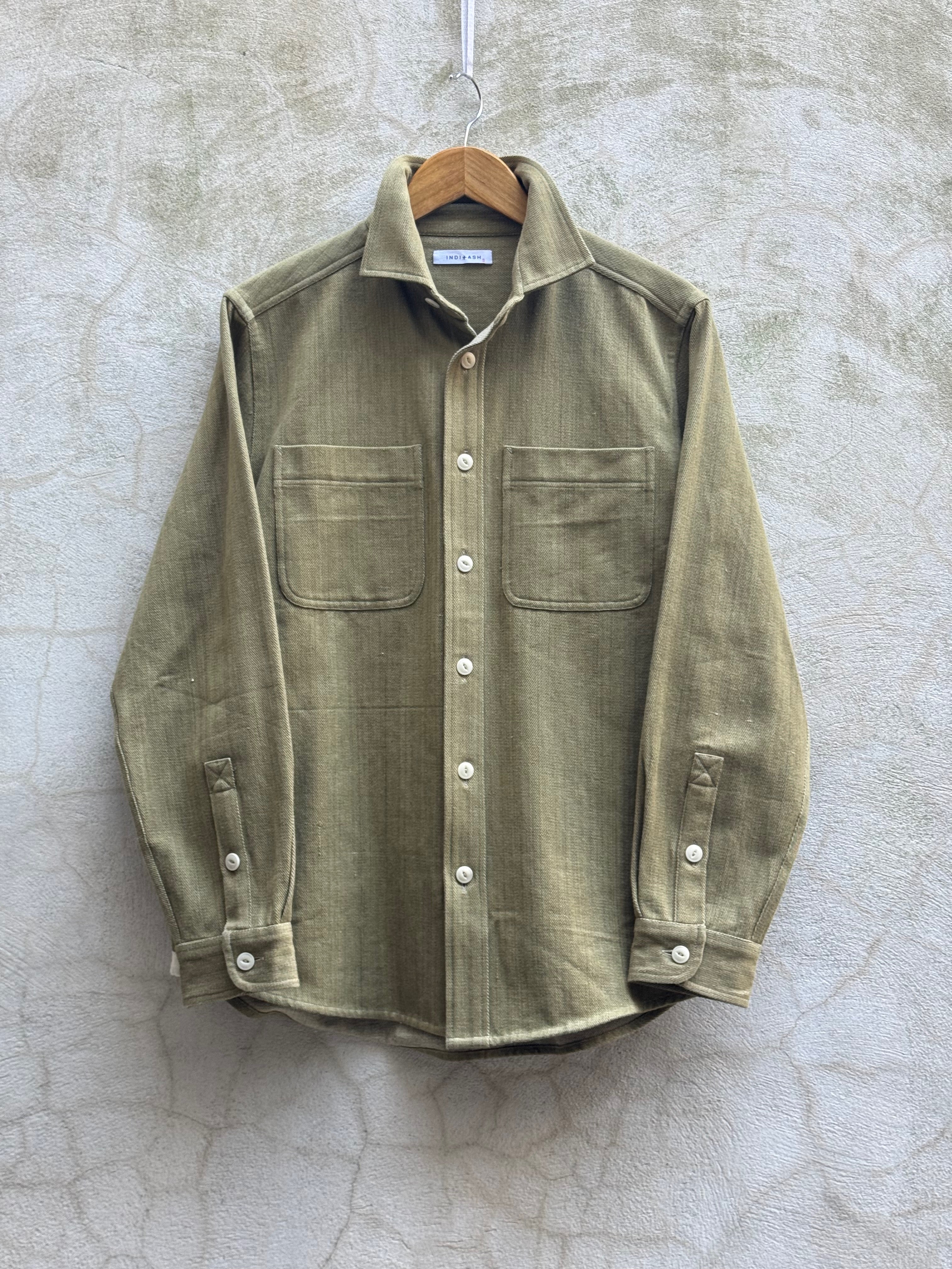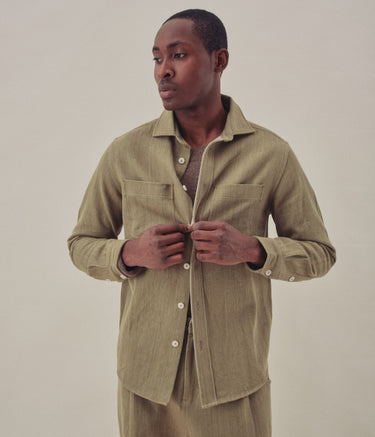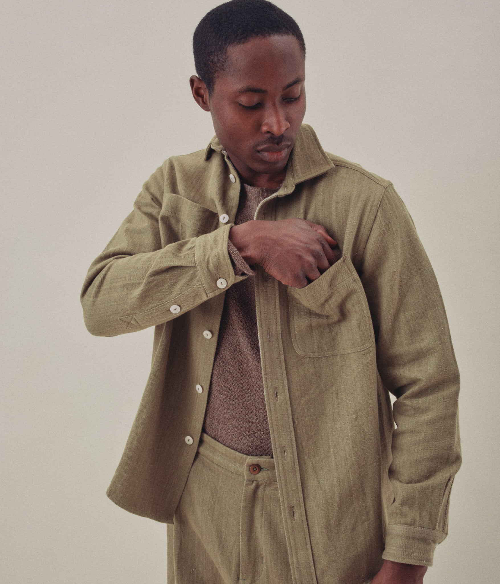 Classic workshirt details inspired by old Big Mac workshirts, in a slightly oversized fit so it can be layered and worn like a jacket. Mother of Pearl fisheye buttons provide a natural twist on a classic detail. Kala Cotton gussets at the side seam with hand embroidered logo.