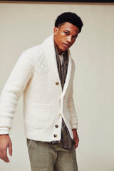 OUR BEST ANDES CARDIGAN YET! We've updated it this season in a heavy blend of Eco Alpaca and naturally dyed pima cotton. This version is all plant based indigo dyed to perfection. Knit on a hand-flat, manual machine, that requires no electricity. The weight is firm and heavy, densely knit, and doubles as a coat. Inspired by vintage kendo jackets, the front and back yoke are detailed with a diamond cable stitch. Horn button closure at front placketMeasurements:
