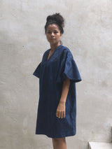 The Cali Dress is made from a beautiful handloomed fabric woven from space-dyed indigo yarns. The yoke is hand-embroidered with a diamond sashiko inspired stitch, a throwback to our kids embroidered Luca Jumper. The Cali Dress has a loose, easy fit and a softly draped sleeve.