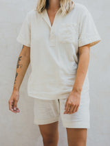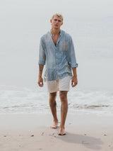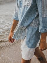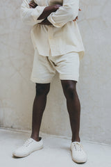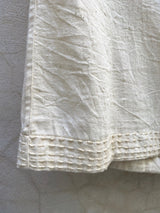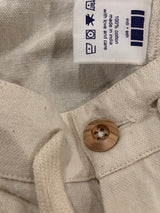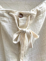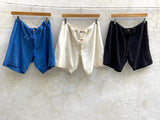 Our new and improved deck short is now a part of our core kala cotton collection. We've made these a bit more substantial by making them a bit bigger in the waist keeping the back pocket and adding side seam pockets. Cut here from undyed wild growing and naturally organic kala cotton handwoven in a fine twill. FInished with an undyed cotton drawstring and unfinished olivewood button at the waist. Subtle hand embroidered trapunto stitch at the leg opening