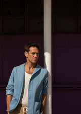 Our Ernest Jacket is. a new style inspired by early issue USN Deck Jackets. We appreciate it for its simplicity. Form and function pared down to clean necessity. A stiff shawl collar contrasts with our drapey light weight handwoven denim. A plant based indigo weft crosses with a natural warp to create a beautiful shade of sky blue.
