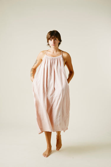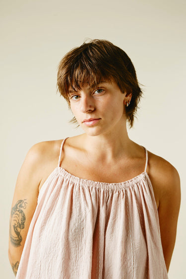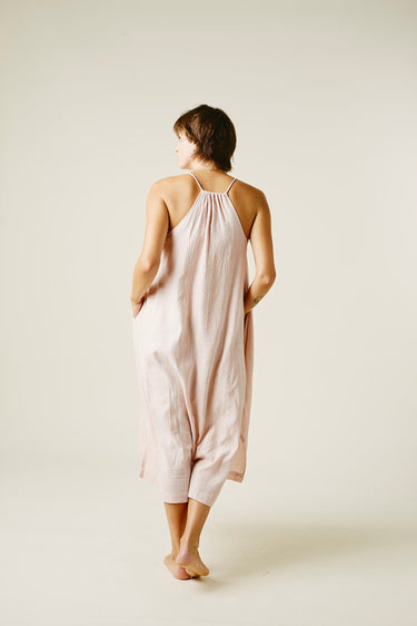 A very limited edition of our favorite Isa Dress. Wild growing cotton, native to Gujarat, India, this fiber grows wild and is naturally organic. Yarn dyed by hand in hanks with beautiful sappanwood (the sawdust from a redwood tree) and handwoven. This version of our Isa Dress is covered in row upon row of random running stitches developed by our partner and best friend Mandira, her mother, and her daughter. Light elastic at the neckline makes this dress incredibly versatile, with an easy fit in this luxurious fabric.