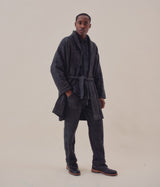 The fabric is truly special. handwoven from Handspun yarns in a broad herringbone, this one is all texture. Diluted iron dyed yarns in the warp are crossed with iron black yarns in the weft that have been dyed with recycled metals and sugar.