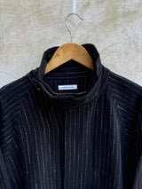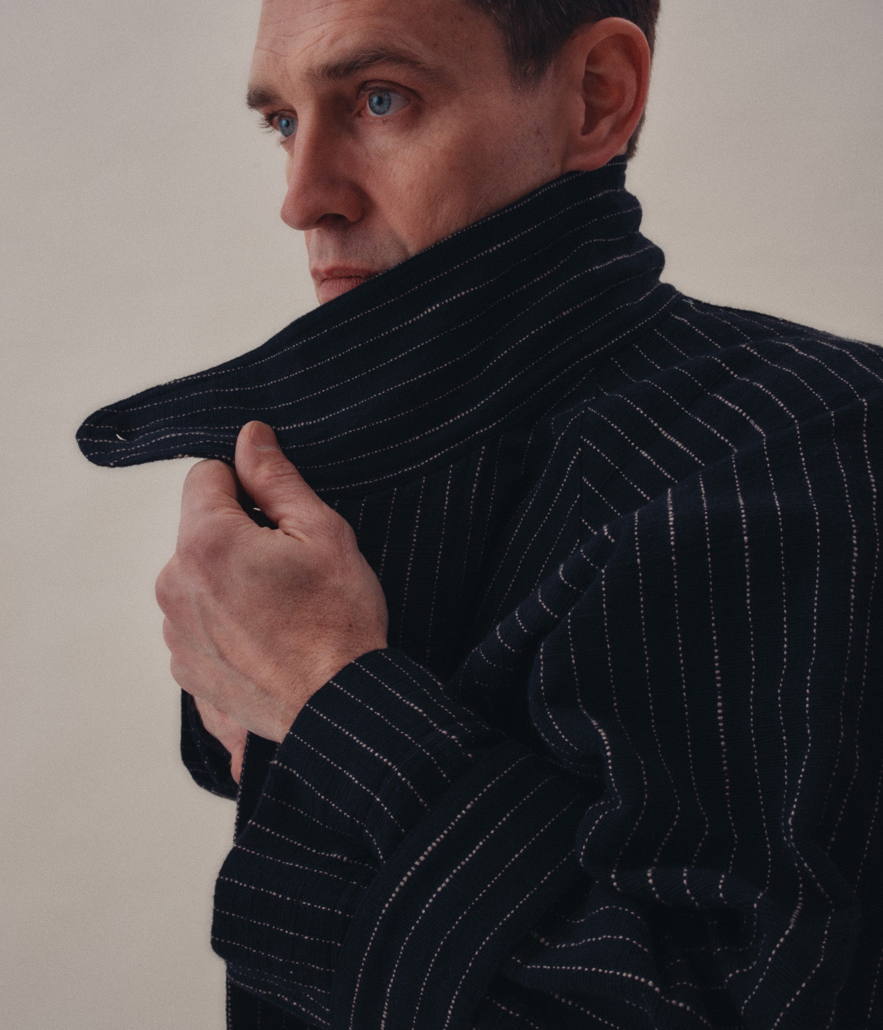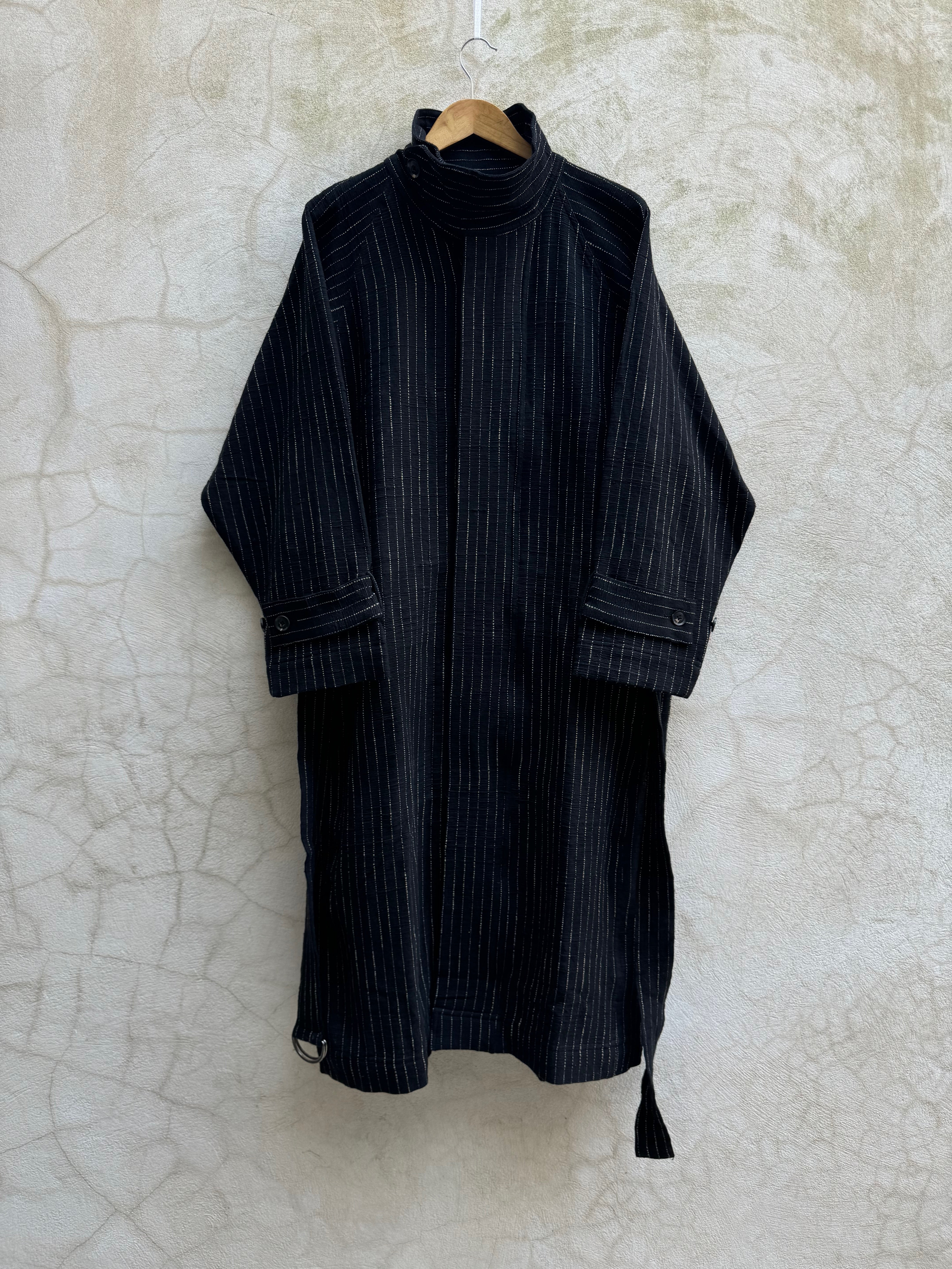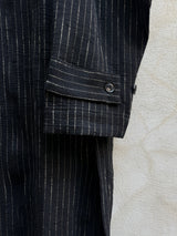 Mill-spun yarns hand-dyed black with iron interrupted by an acacia dyed handspun yarn to create our first pinstripe fabric.
