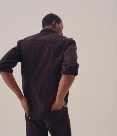 Handwoven medium weight cotton canvas. A space dyed effect achieved by twisting different shades of handspun yarns in the fabric weft. Woven from handspun yarns hand dyed with madder root and iron dye, crossed with mill-spun iron dyed warp yarns