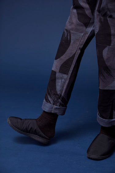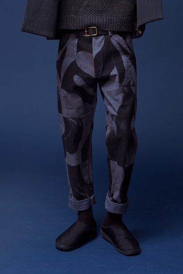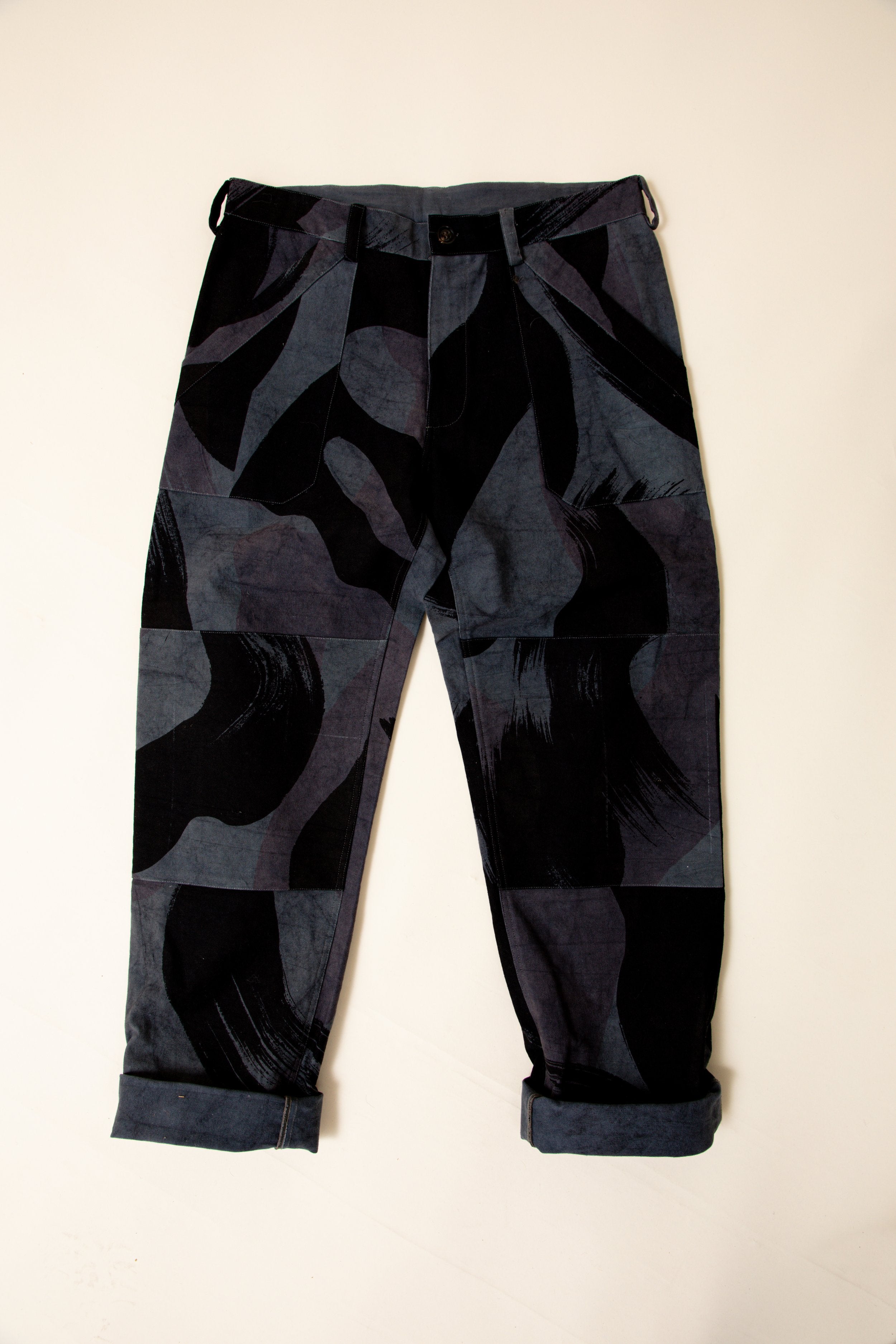 Organic cotton canvas. French workwear details, with reinforcements at the knee and patch pockets, in a relaxed, straight fit. Inspired by 1940's British Denison Camo, this has been hand screen printed with 42" screens and iron black paste, then overdyed multiple times in an iron vat to get these levels of gray and black.