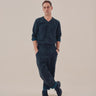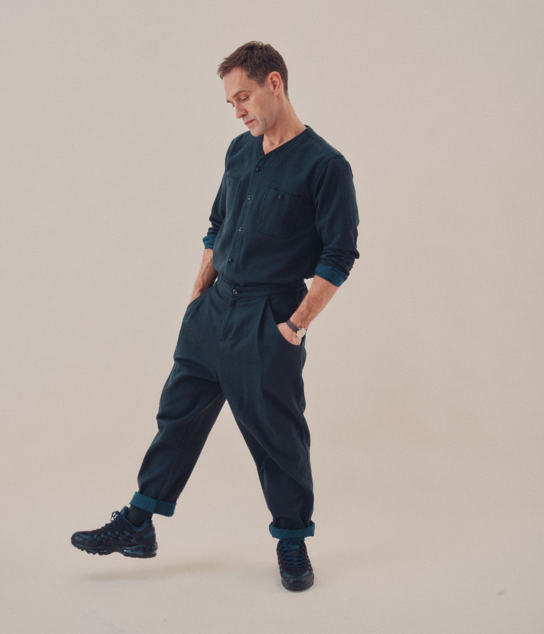 The Nico Pant is a new development. Built to combine a tailored look with an easy comfortable fit. Deep pleats at front with a long rise. Elastic waistband at back. Tuck pleats at Interior knee for some shaping at the leg with a full thigh and tapered leg.