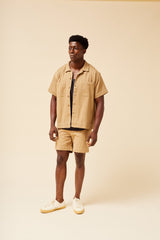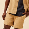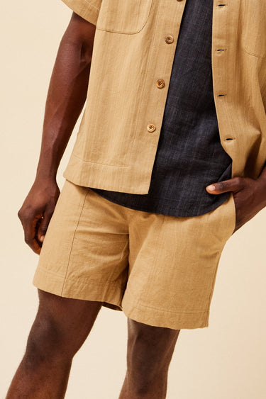The Obelisk short is inspired by vintage USMC military pants. This issue is in our powerloomed cotton canvas. Yarns dyed with myrobalan flower and tea. Patch pockets, integral hollywood waistband with an interior drawcord at the waist with grommet exits. Button fly. 6.5" inseam. Fits is true to size.