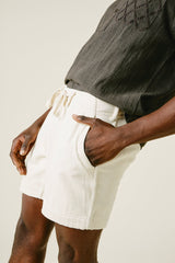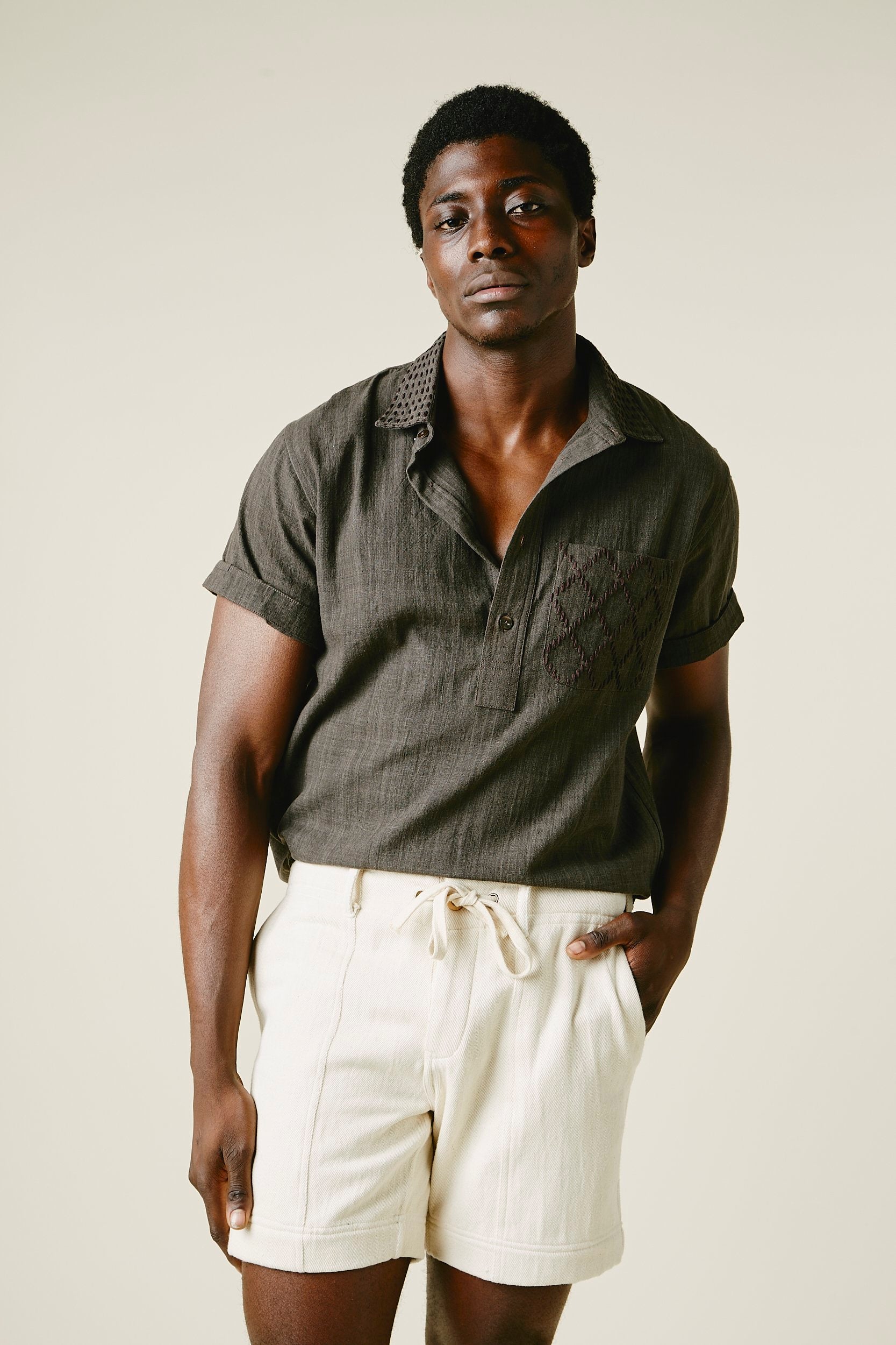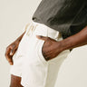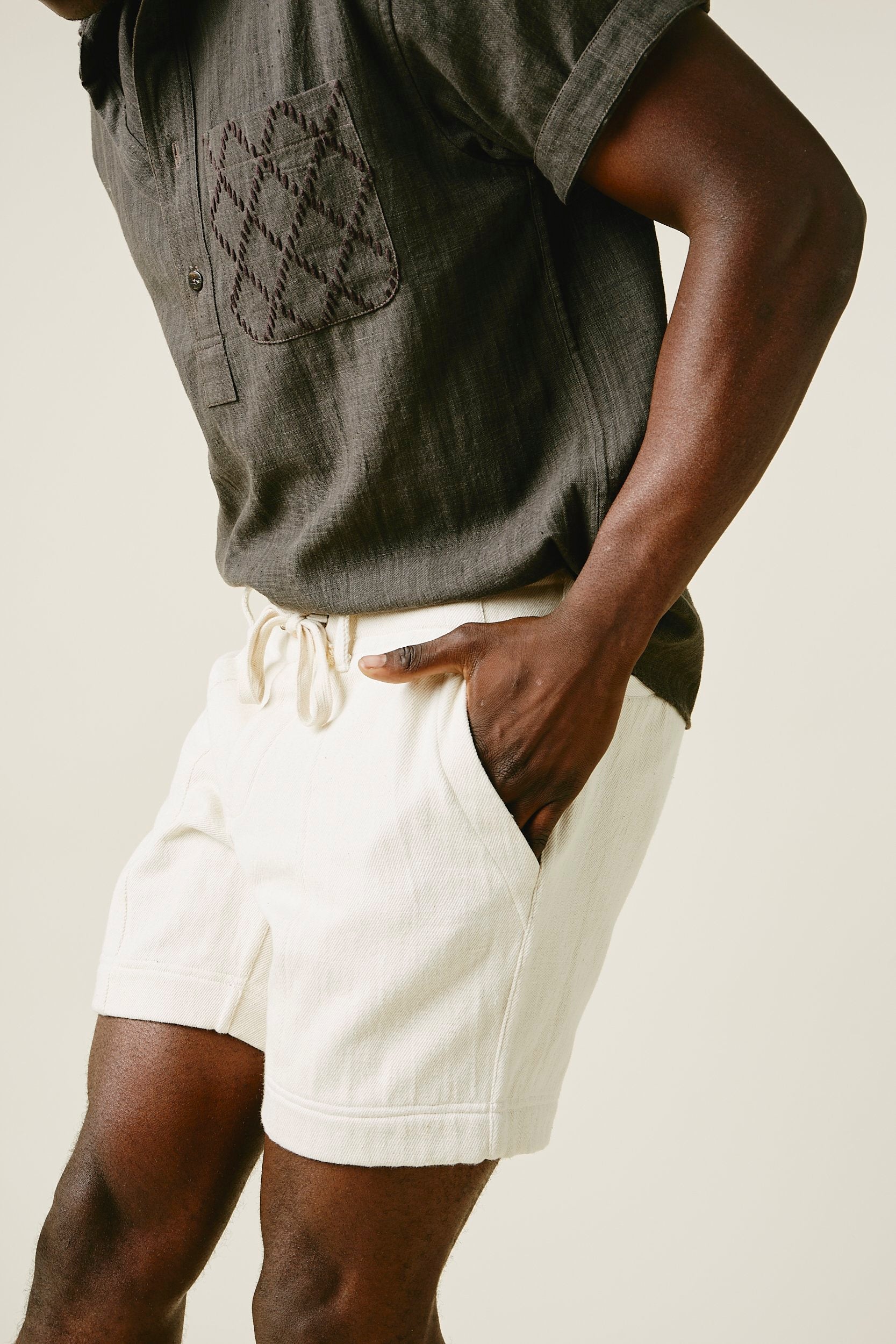 The Obelisk short is inspired by vintage USMC military pants. This issue is in our powerloomed natural denim. undyed raw yarns, with hints of cracked seeds woven in a 2X1 twill. Patch pockets, integral hollywood waistband with an interior drawcord at the waist with grommet exits. Button fly. 6.5" inseam. Fits true to size.