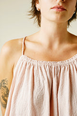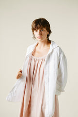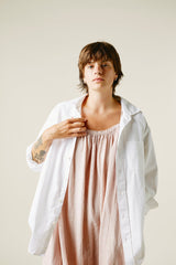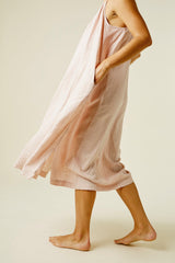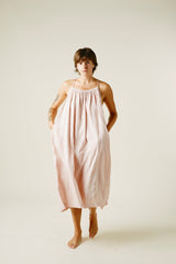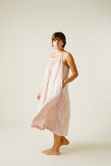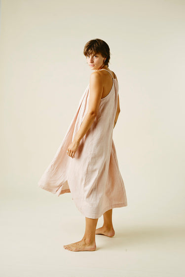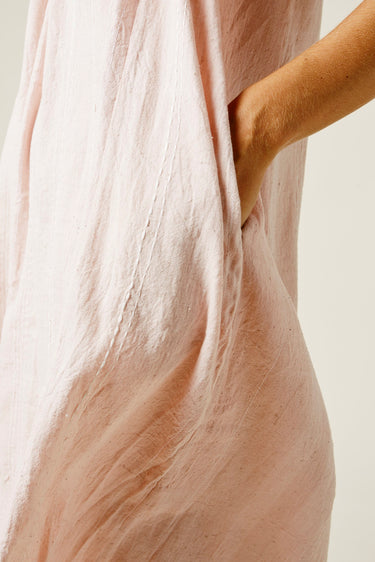 A very limited edition of our favorite Isa Dress. Wild growing cotton, native to Gujarat, India, this fiber grows wild and is naturally organic. Yarn dyed by hand in hanks with beautiful sappanwood (the sawdust from a redwood tree) and handwoven. This version of our Isa Dress is covered in row upon row of random running stitches developed by our partner and best friend Mandira, her mother, and her daughter. Light elastic at the neckline makes this dress incredibly versatile, with an easy fit in this luxurious fabric.