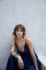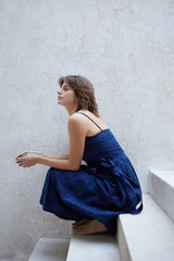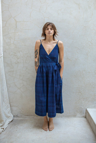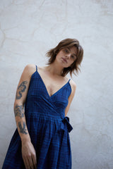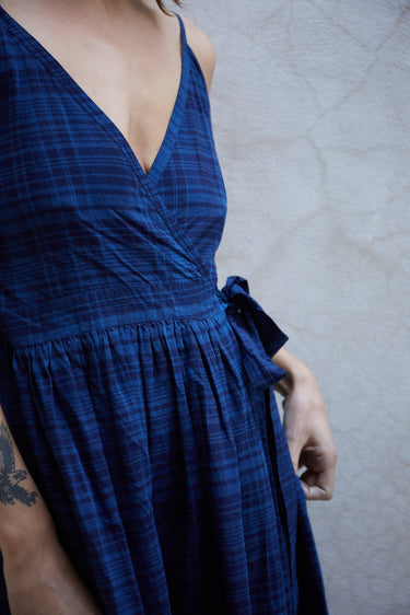 The Mica wrap dress is a new addition to our assortment this season. An easy to wear wrap cut with adjustable straps makes this a versatile piece for spring through summer. Cut in our shuttle loom bleeding madras woven with organic cotton yarns dyed with plant based indigo. Once washed this is shipped with a slight rumple. Cold water wash in the machine and hang dry. Wear rumpled or lightly steam.