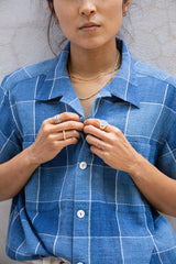 We took all of the best details from mid century USN chambray shirts. Wide french placket, one piece camp collar, double chest pockets, and oversized fit. We developed this beautiful handwoven box check with our non-profit partners in Gujarat, India. Woven from wild-growing kala cotton yarns dyed to different levels of blue with plant based indigo, this fabric is naturally organic, with the most amazing light weight and drape. White mother of pearl fisheye buttons. Cold water machine wash with like colors and hang dry. Measurements: