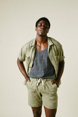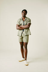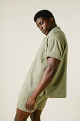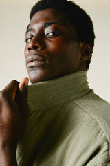 We took all of the best details from mid century USN chambray shirts. Wide french placket, one piece camp collar, double chest pockets, and oversized fit. Issued here in our od green military herringbone. Yarns dyed with a mix of henna, turmeric, and iron water. Burnt olivewood flying saucer buttons. Cold water machine wash with like colors and hang dry. This season we've made some adjustments to fit, making it true to size. Yabi is 6' and wears a sz 3