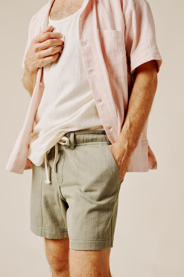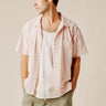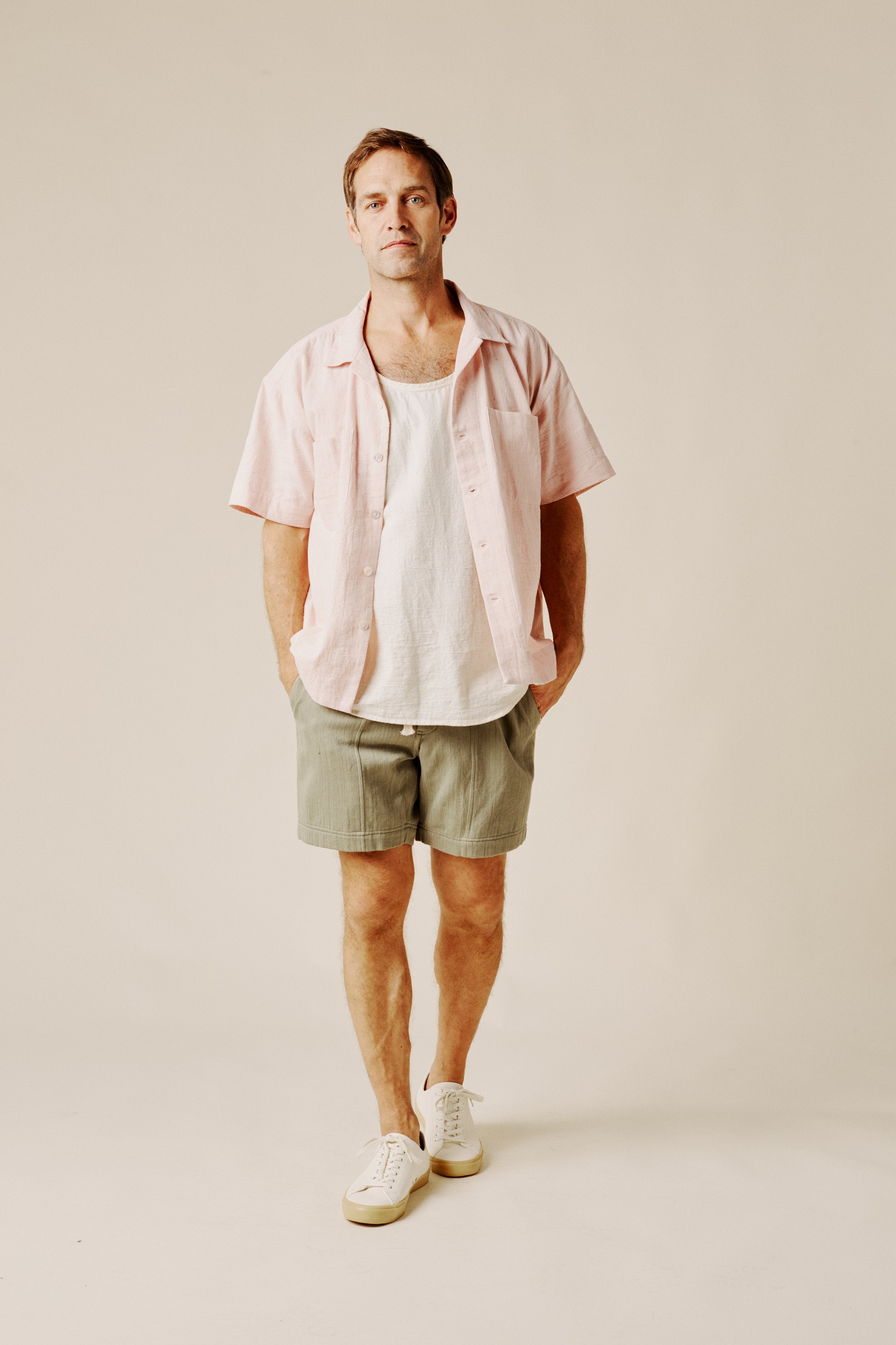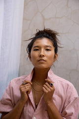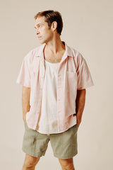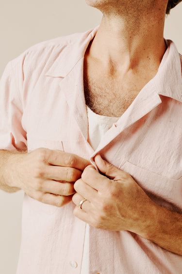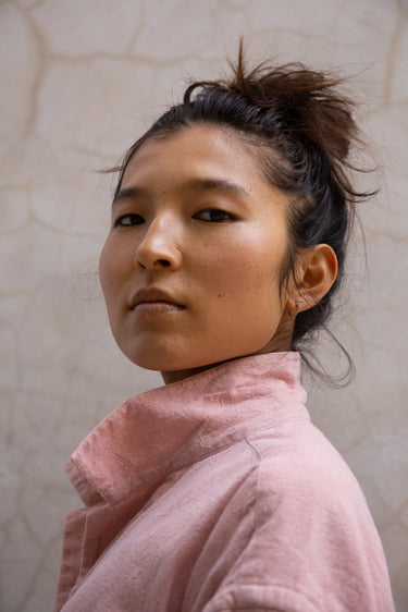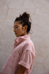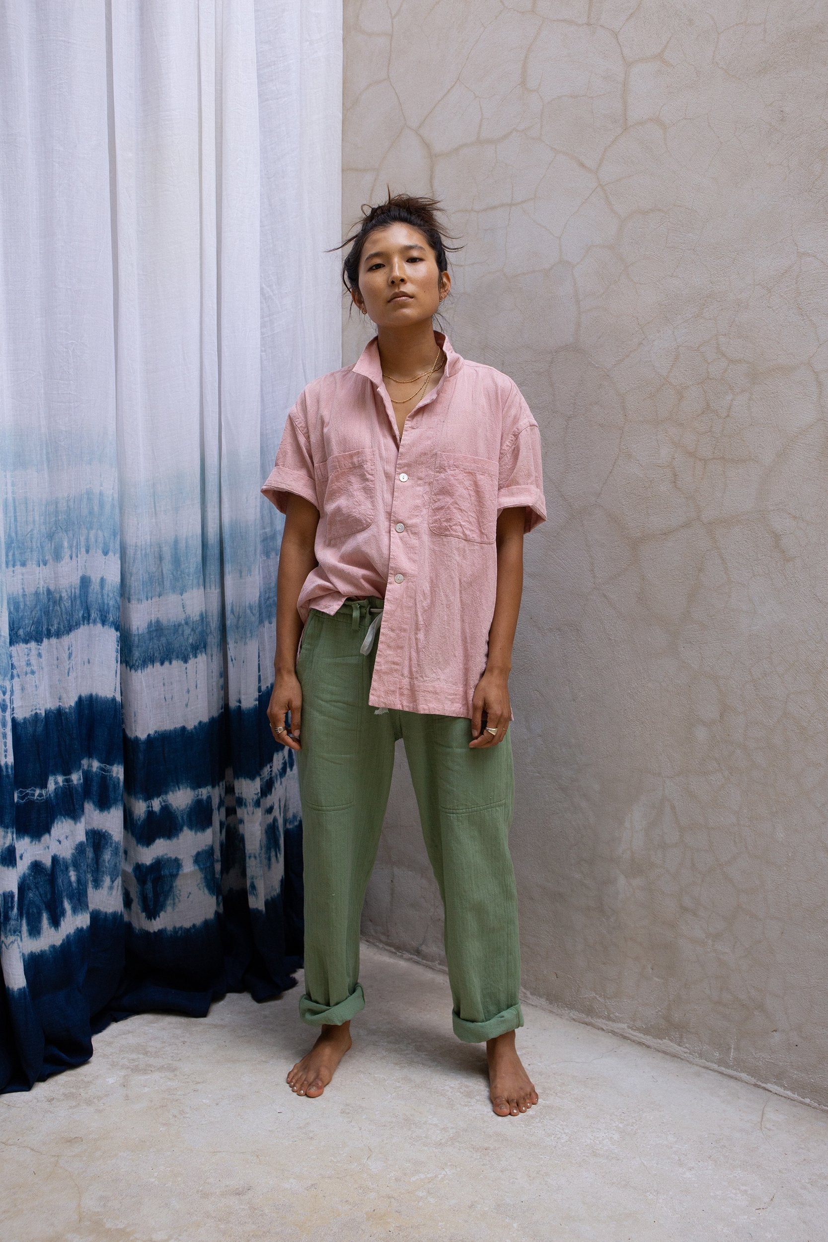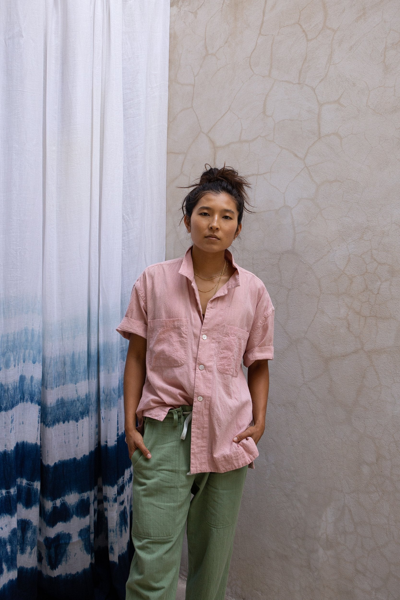 The best summer pink, here our kala cotton twill is yarn dyed with sappanwood, the pink color extracted from sawdust. so soft its almost a neutral this is quickly becoming one of our favorite dyes to work with. Re-issued this season in our improved Lake Camp Shirt fit. We took all of the best details from mid century USN chambray shirts. Wide french placket, one piece camp collar, double chest pockets, and oversized fit. White mother of pearl fisheye buttons. Cold water machine wash with like colors and hang dry. Chandler is 6' and wears a sz 3