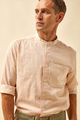 Our LS Band Shirt is back, this time in a fun mix of block printed bengal stripes. Our handwoven kala cotton, block printed with plant based Indian Madder Root paste, and patched together in a beautiful and subtle mix of stripes.