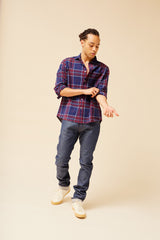 A classic, easy fitting shirt, single tailor construction finished with french seams, and built to last. Trimmed at interior placket and gusset details in dark indigo kala cotton and finished akoya shell buttons. Perfect plaid matching at side seams and pocket.