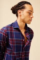 Our Matty Shirt in handwoven madras. The yarns are a beautiful cross of plant based indigo and indian madder root. A beautifully textured medium weight spring and summer staple.