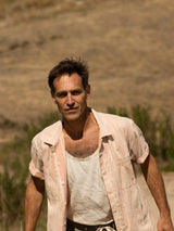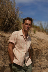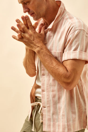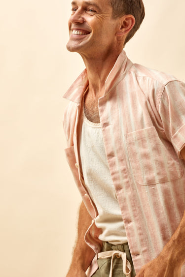 The same fit as our Lake Camp - This is meant to be worn as an overshirt or light weight jacket. Block printed with multiple impressions to ensure that the stripe is visible on both sides, and finished so expertly that the style can be worn both inside and out.