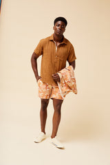 Fabric handwoven from yarns dyed to a beautiful golden brown with cutch - sawdust from the heartwood of a redwood tree. The hand dyed yarns lend an uneven banding that appears as subtle uneven striping on the textile and gives it the appearance of raw silk. Yabi is 6'1" and wears size 3