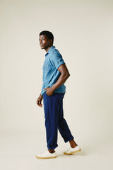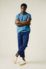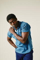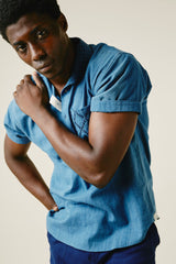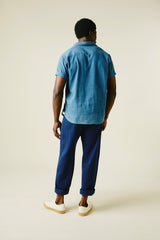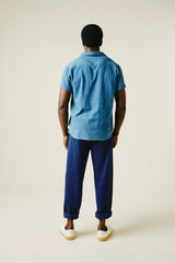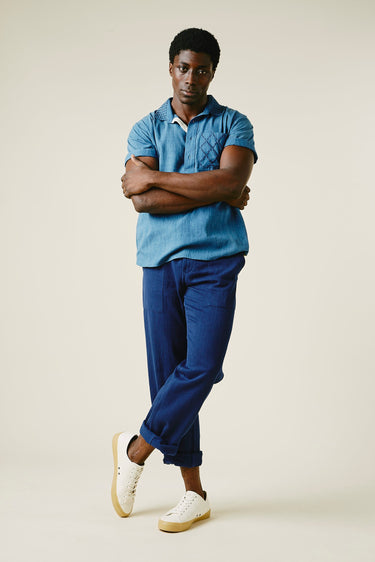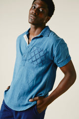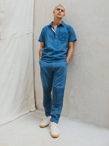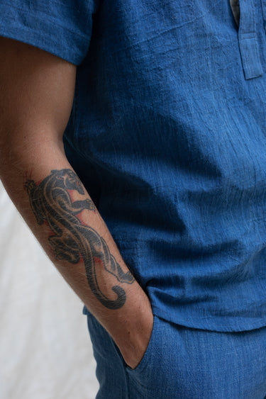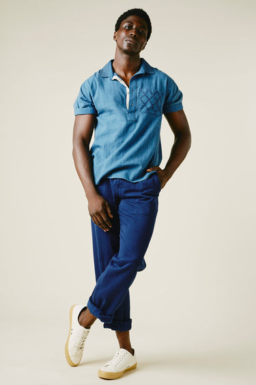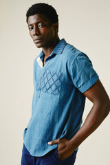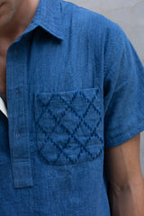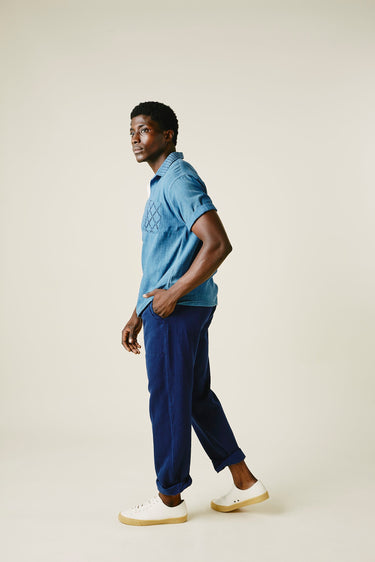 Part of our core Kala Cotton collection, this is our unisex embroidered Cedar Shirt in yarn dyed indigo. Wild growing organic cotton, yarn dyed with plant based indigo, then handwoven into the finest twill for the most comfortable fabric ever in the most perfect medium blue. A reissue of our favorite best selling shirt now in 3 colors, natural, indigo yarn dye, and iron black piece dye. Tonal diamond running stitch hand embroidery at the chest pocket and trapunto stitch at the collar. Half Placket, Mother of Pearl buttons, french seams, and single tailor construction.