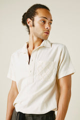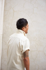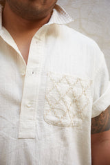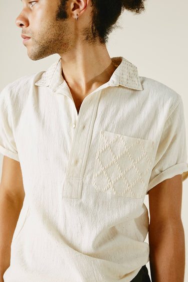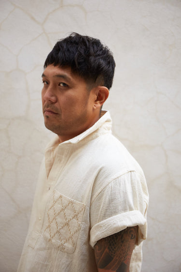 Part of our new core Kala Cotton collection, this is our unisex embroidered Cedar Shirt in its purest form. undyed wild growing organic cotton, handwoven into the finest twill for the most comfortable fabric ever. A reissue of our favorite best selling shirt now in 3 colors, natural, indigo yarn dye, and iron black piece dye. Tonal diamond running stitch hand embroidery at the chest pocket and trapunto stitch at the collar. Half Placket, Mother of Pearl buttons, french seams, and single tailor construction.