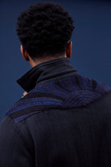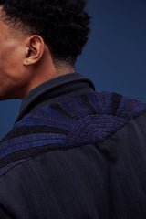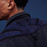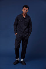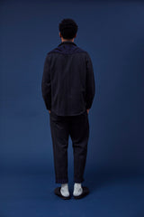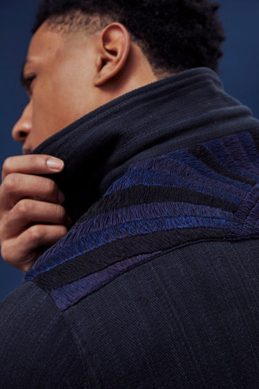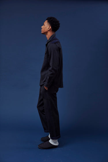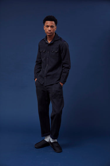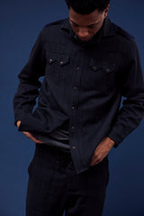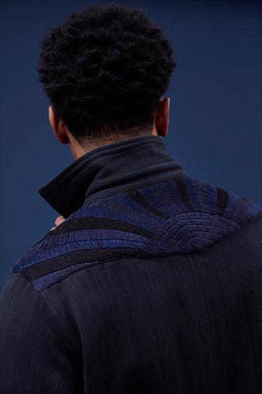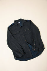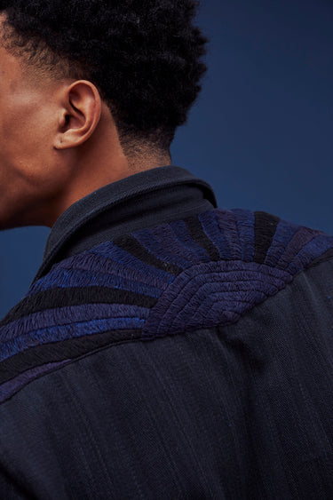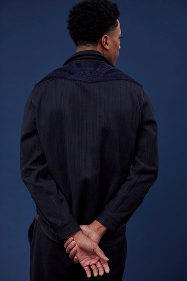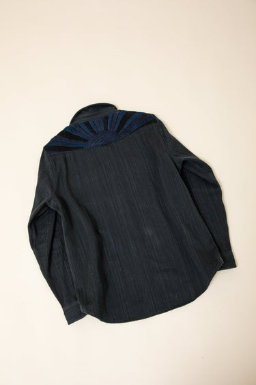 A very special and limited edition - The Sunset Western, like its predecessor the sawtooth was inspired by our time in Stanley, Idaho wandering the sawtooth mountain range. A very special and time consuming hand embroidery inspired by the landscape and rustic architectural flourishes of Stanly. Sawtooth double point snap pockets at the chest with a western pointed yoke. Indigo and Iron yarns woven in a classic 2X1, dense enough to last forever, but soft and drapey enough to wear everyday. A slightly oversized fit so it can be layered and worn like a jacket. Single Tailor Construction. Specially developed antique brass and horn western snaps with a metal logo concha shank button at the collarstand inspired by our pup Sunshine. Spot clean, hand wash, and hang dry. Brandon is 6'2" and wears size 3.