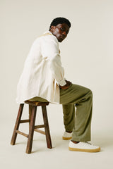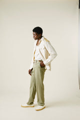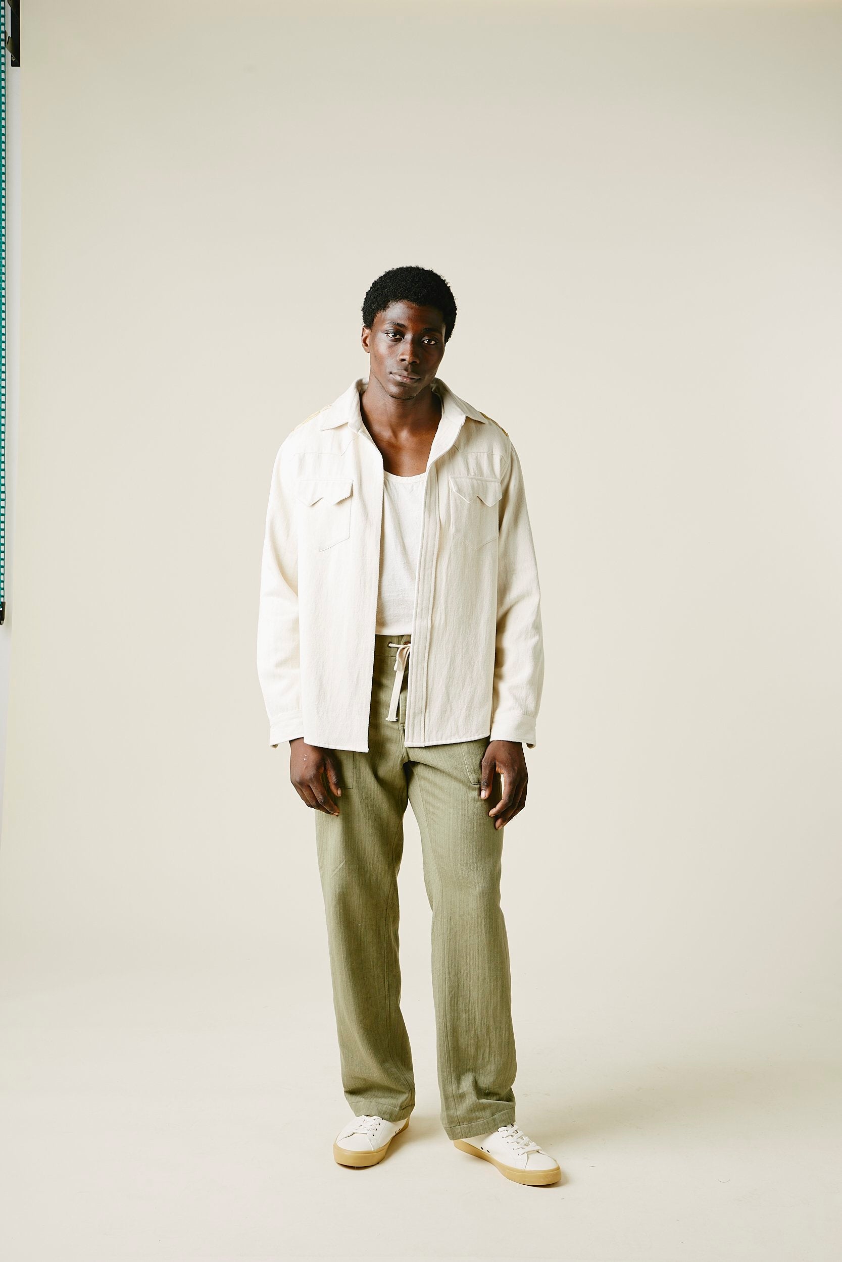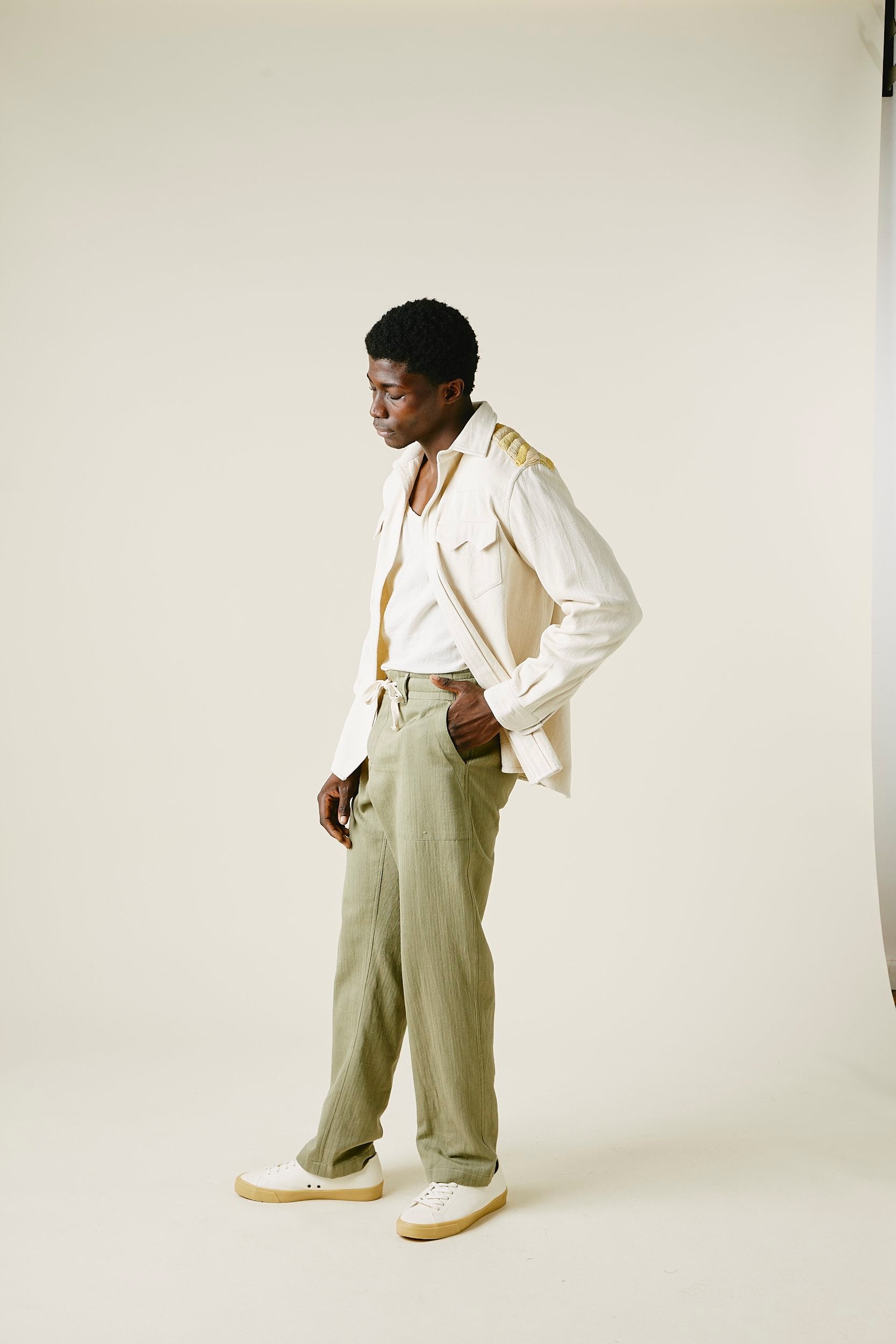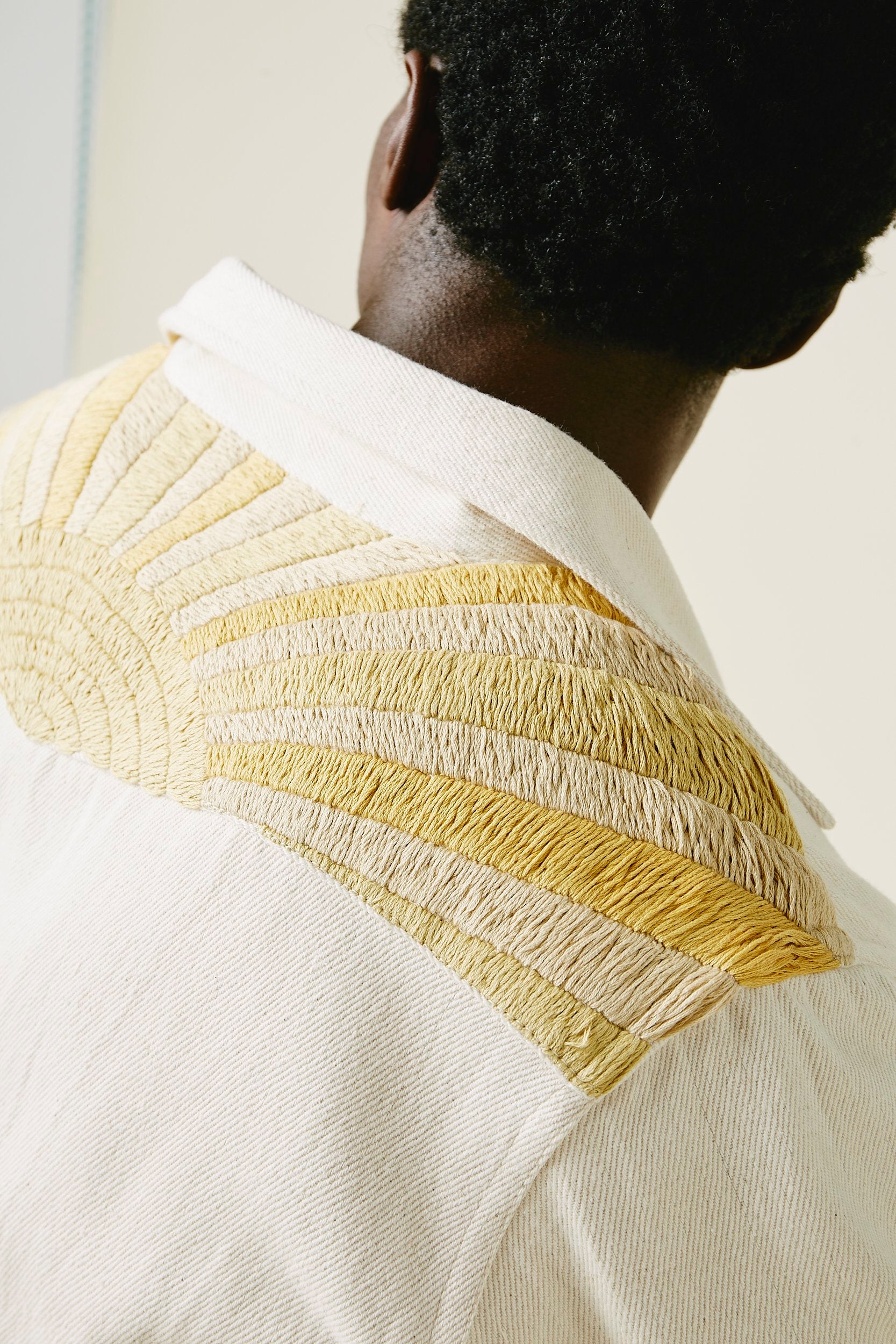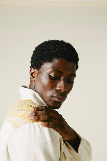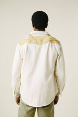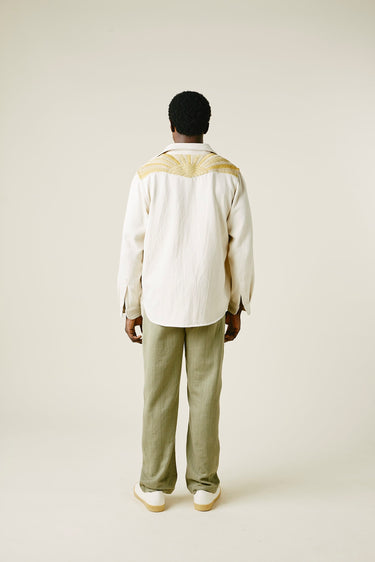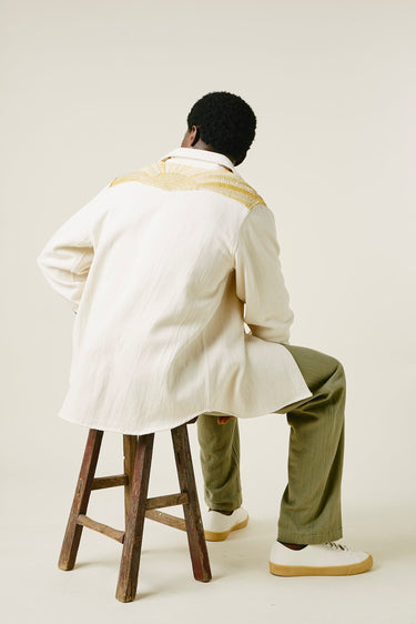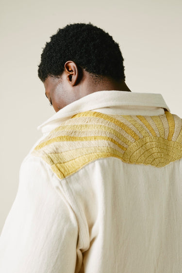 A very special and limited edition - The Sunshine Western, like its predecessor the sawtooth was inspired by our time in Stanley, Idaho last year wandering the sawtooth mountain range. A very special and time consuming hand embroidery inspired by the landscape and rustic architectural flourishes of Stanley. Sawtooth double point snap pockets at the chest with a western pointed yoke. Undyed yarns woven in a classic 2X1, dense enough to last forever, but soft and drapy enough to wear everyday. A slightly oversized fit so it can be layered and worn like a jacket. Single Tailor Construction. Specially developed antique brass and bone western snaps with a metal logo concha shank button at the collarstand. Yabi is 6'1" and wears size 3.