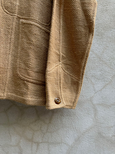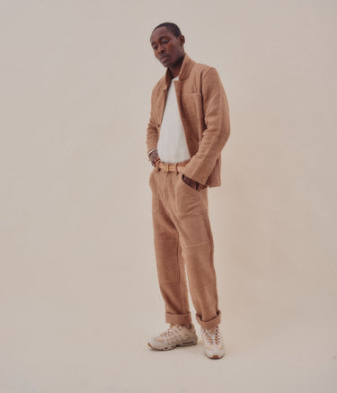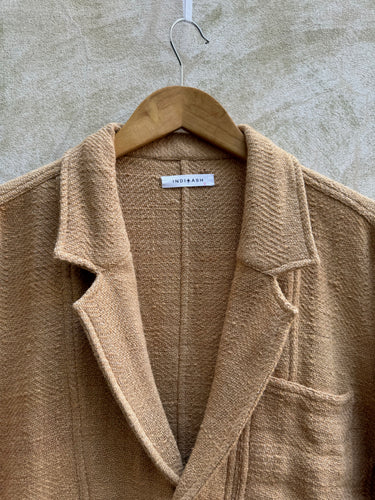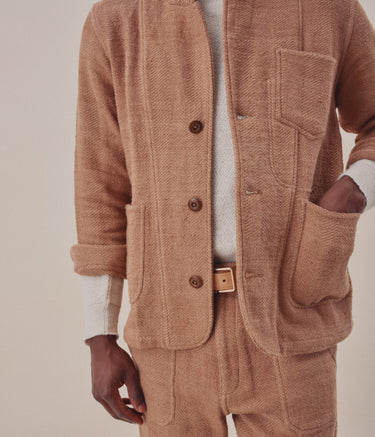 Built with the intention of providing an unconstructed suit, this one looks great with its partner the Isaac Pant, but also easy with a pair of jeans. Inspired by vintage French chore coats, The Study Blazer is unconstructed, with patch pockets at the exterior and interior, and a slightly dropped, modern notch lapel. . A boxy, straight fit, with slightly shorter sleeves. Finished with flat felled and french seams, its so clean you can wear it inside out. The fabric is truly special. Handwoven from handspun yarns in a broad herringbone, this one is all texture. Machine wash cold and hang dry.