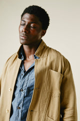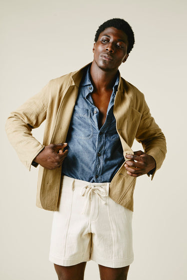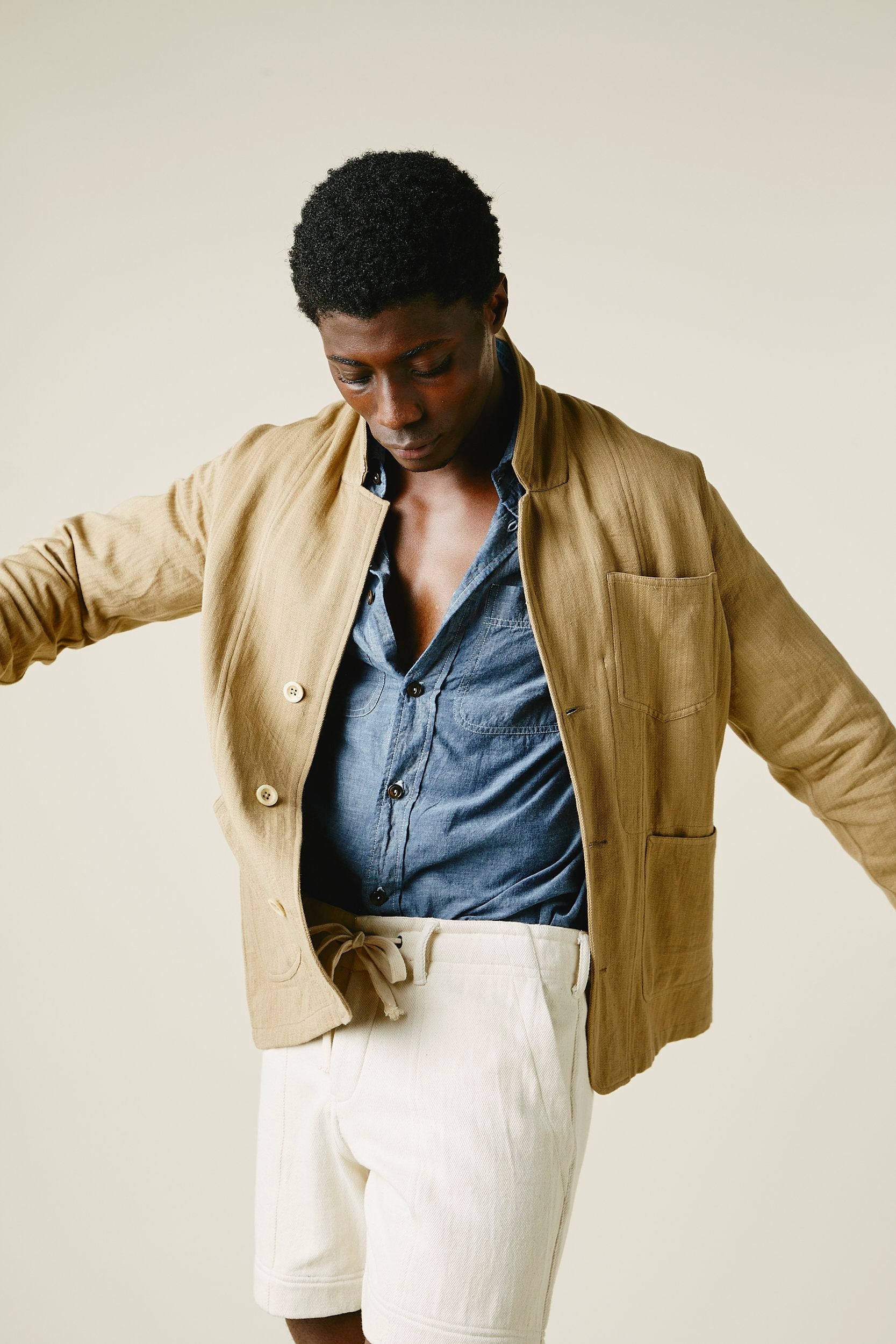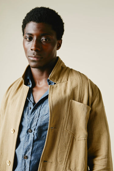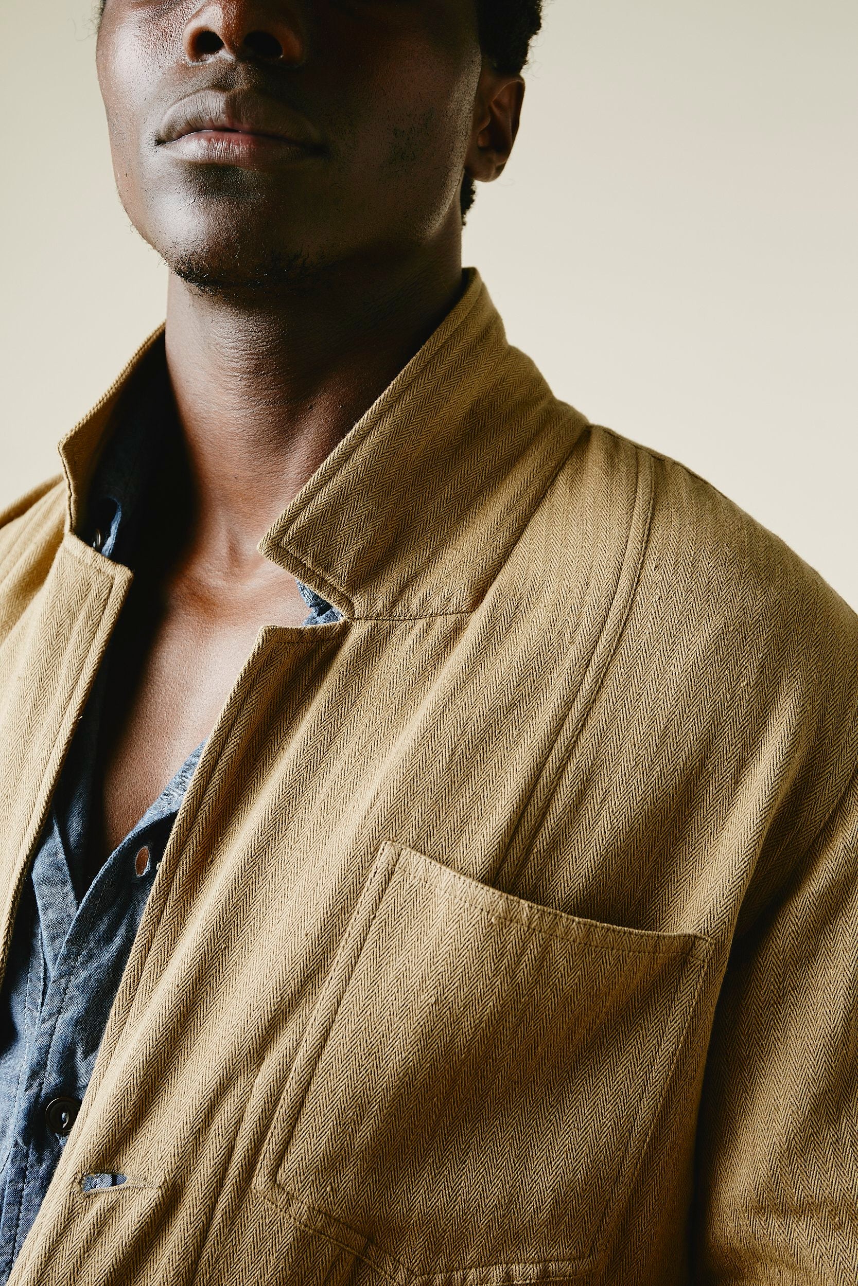 Inspired by vintage French chore coats, The Study Coat is unconstructed, with patch pockets at the exterior and interior, and a slightly dropped, modern notch lapel. . A boxy, straight fit, with slightly shorter sleeves. Finished with flat felled and french seams, its so clean you can wear it inside out. The fabric is truly special. Our fine handwoven military herringbone, the texture is subtle and beautiful. Yarns are dyed with a mix of myrobalan, and tea. Bone buttons, 100% cotton stitching thread. Machine wash cold and hang dry.