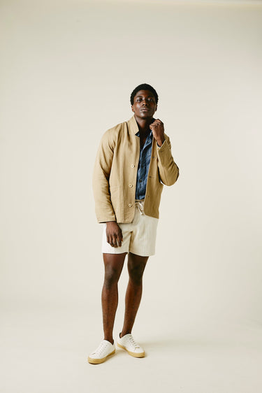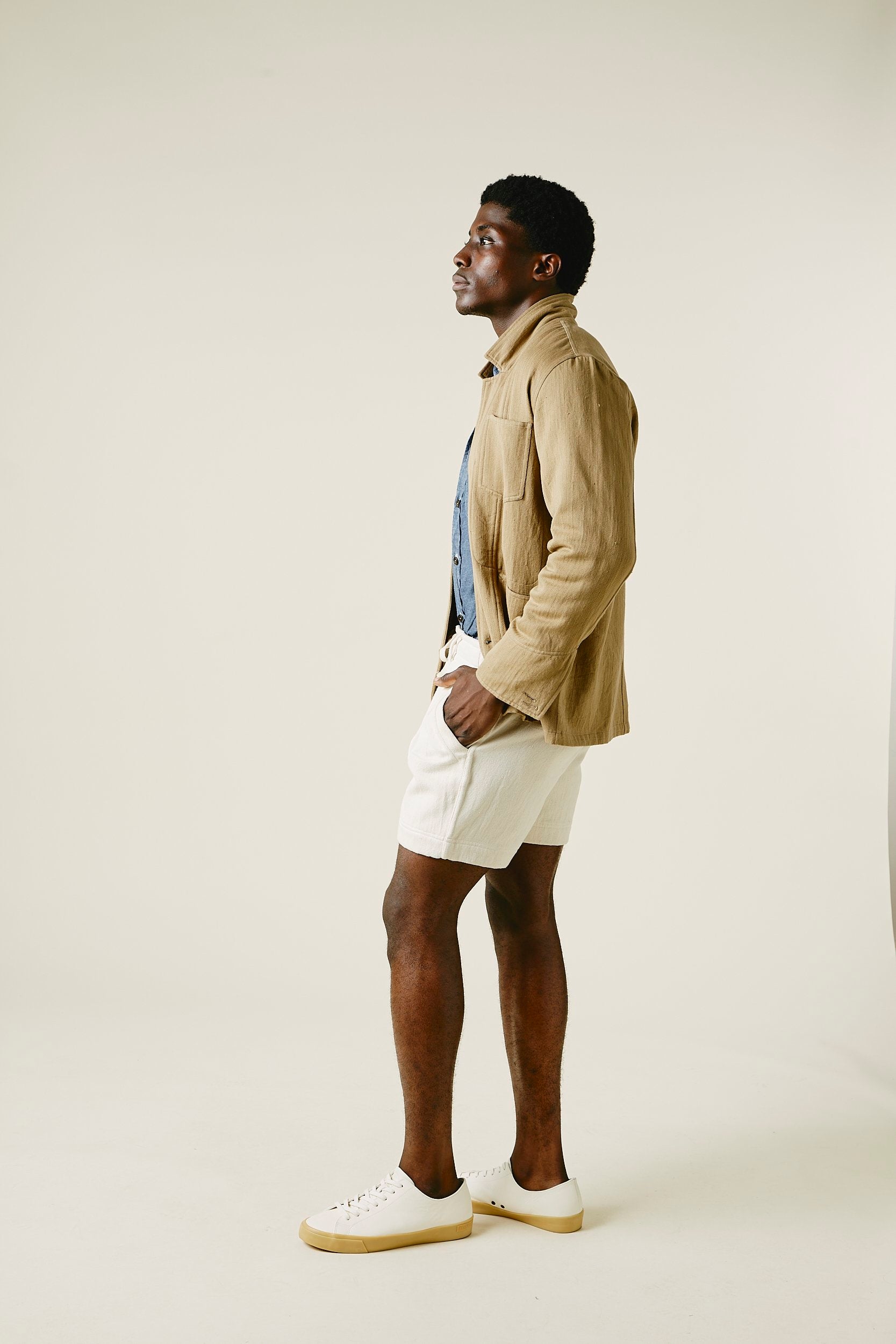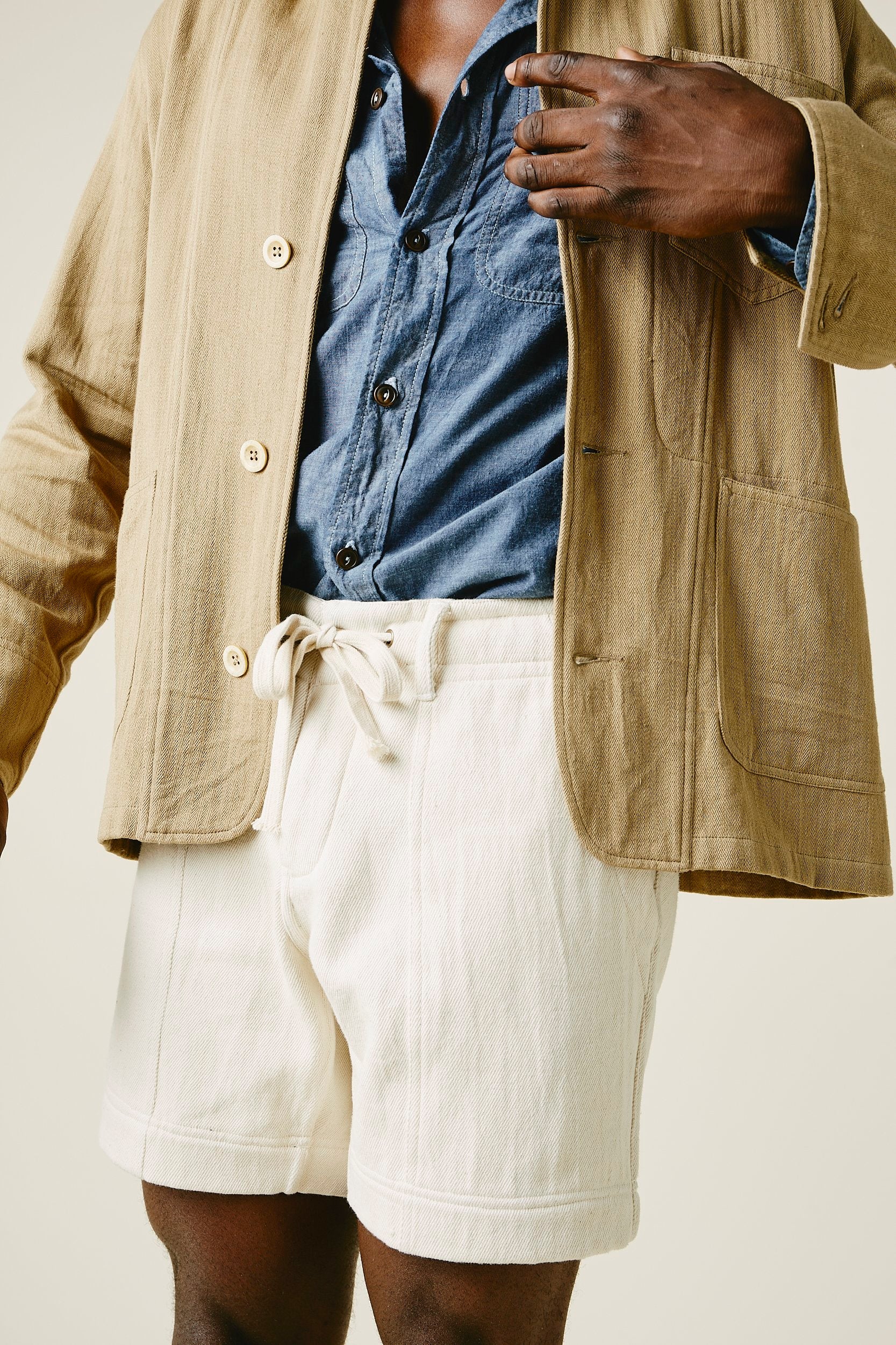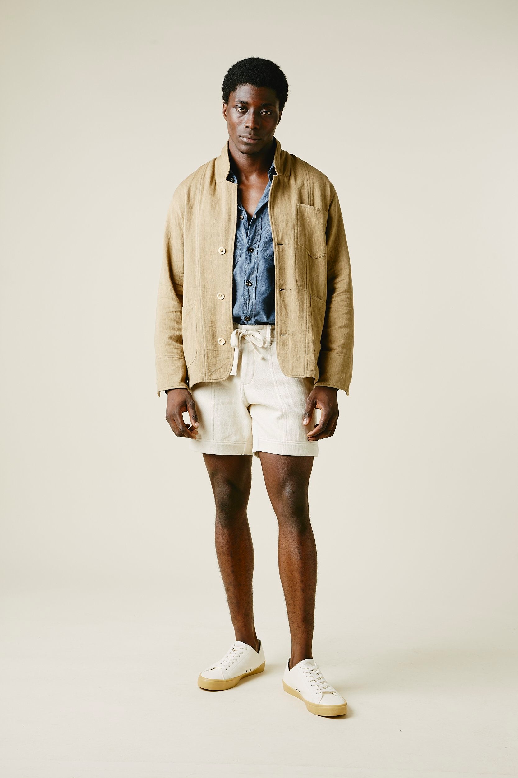 Inspired by vintage French chore coats, The Study Coat is unconstructed, with patch pockets at the exterior and interior, and a slightly dropped, modern notch lapel. . A boxy, straight fit, with slightly shorter sleeves. Finished with flat felled and french seams, its so clean you can wear it inside out. The fabric is truly special. Our fine handwoven military herringbone, the texture is subtle and beautiful. Yarns are dyed with a mix of myrobalan, and tea. Bone buttons, 100% cotton stitching thread. Machine wash cold and hang dry.