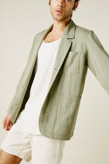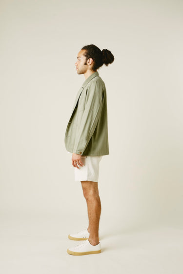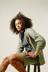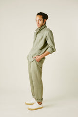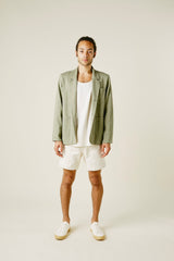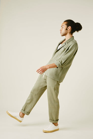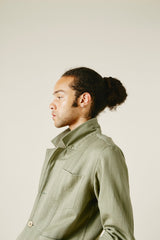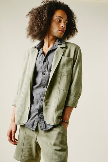 Inspired by vintage French chore coats, The Study Coat is unconstructed, with patch pockets at the exterior and interior, and a slightly dropped, modern notch lapel. . A boxy, straight fit, with slightly shorter sleeves. Finished with flat felled and french seams, its so clean you can wear it inside out. The fabric is truly special. Our fine handwoven military herringbone, the texture is subtle and beautiful. Yarns are dyed with a mix of henna, turmeric, and iron water. Bone buttons, 100% cotton stitching thread. Machine wash cold and hang dry.