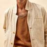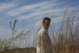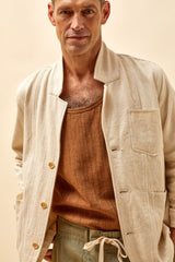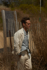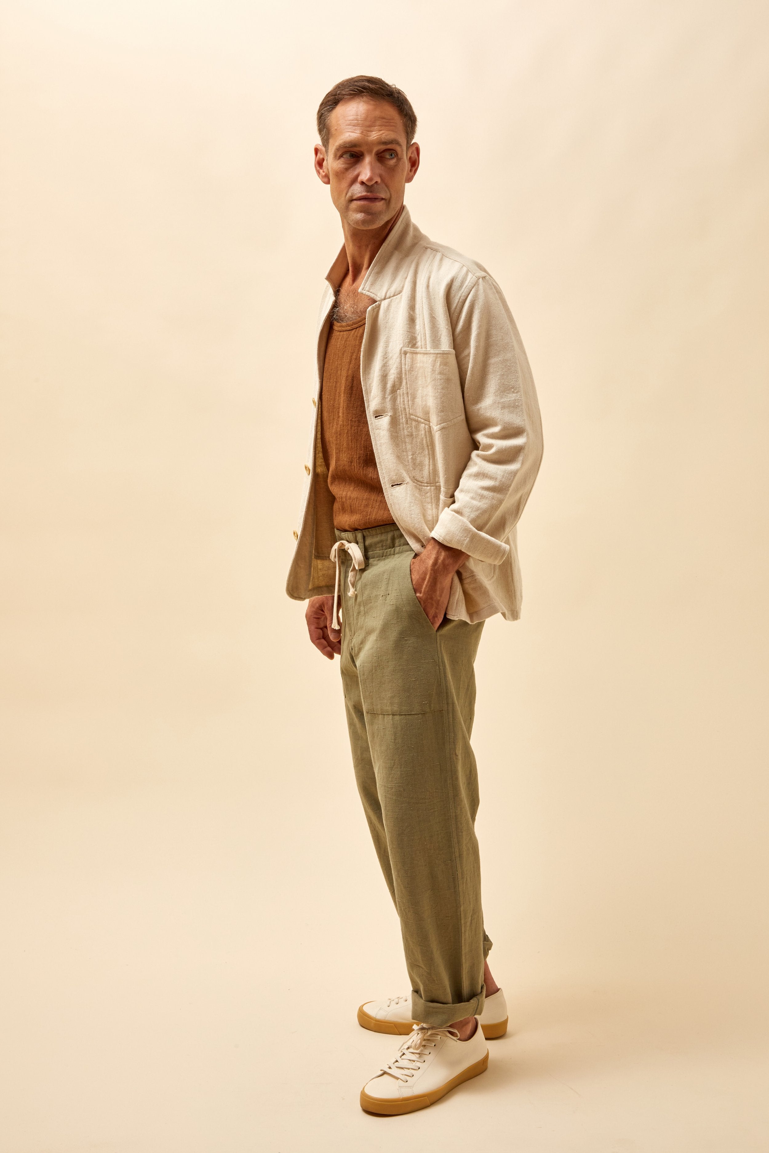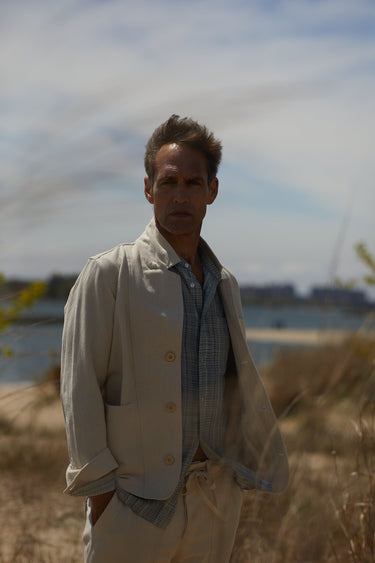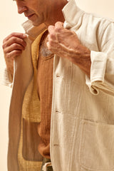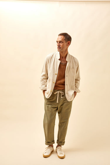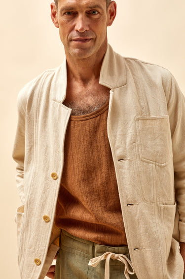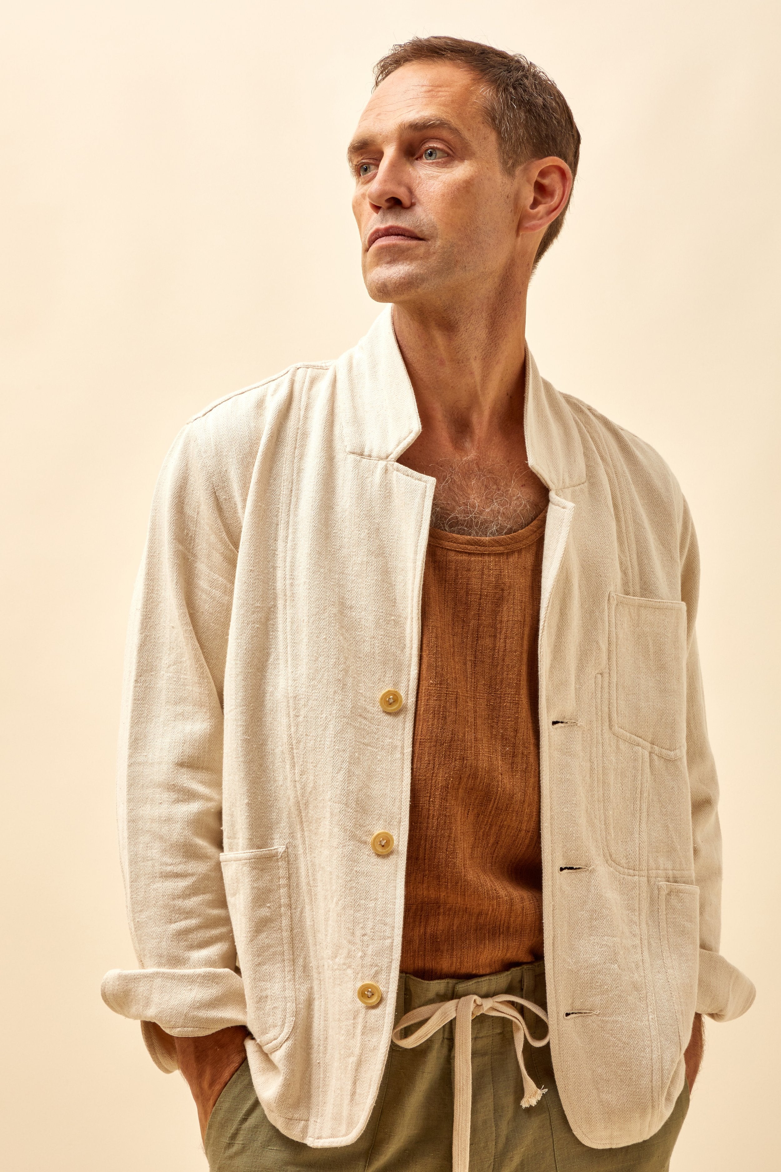 The fabric is truly special. Our fine handwoven military herringbone, the texture is subtle and beautiful. This is the first time that we have developed this fabric in its pure, undyed state. The texture is insane, exaggerated by the beauty of neps and cracked seeds. This may be the perfect spring jacket