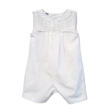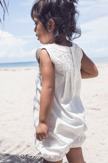 Cut in Classic White Cotton Poplin, a beautiful floral embroidery highlights the front and back yoke. The hand embroidery is dense yet soft, the irregularities in the embroidery allow you to see the hands of the artisan behind the style. A button closure at the back neck makes it easy to pop on and off. Size 1 and 2 have snaps at the inseam