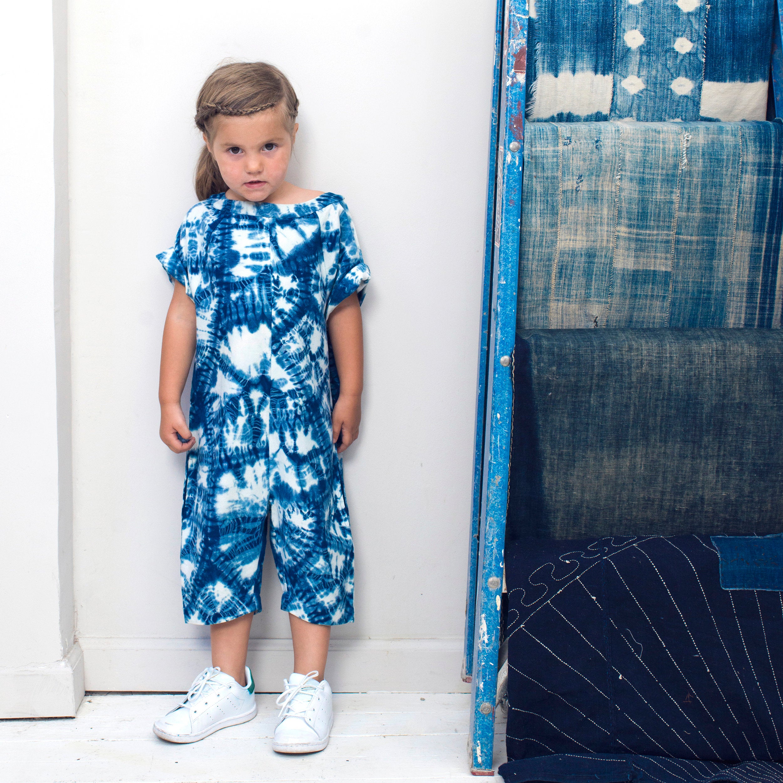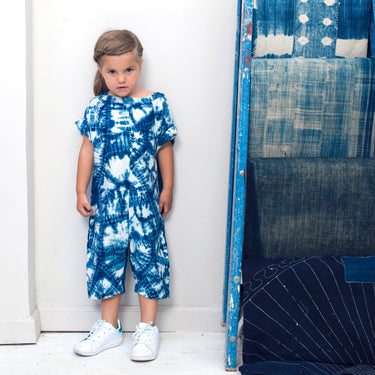 The Luca Romper's silhouette was inspired by Classic American Sweatshirt details. Its featured here cut in a soft cotton basketweave. This version features our monster shibori technique, check out the detail pics to see what this looks like in process. Pockets at side seams for storing toys, sticks, and rocks. Button closure at back neck.