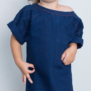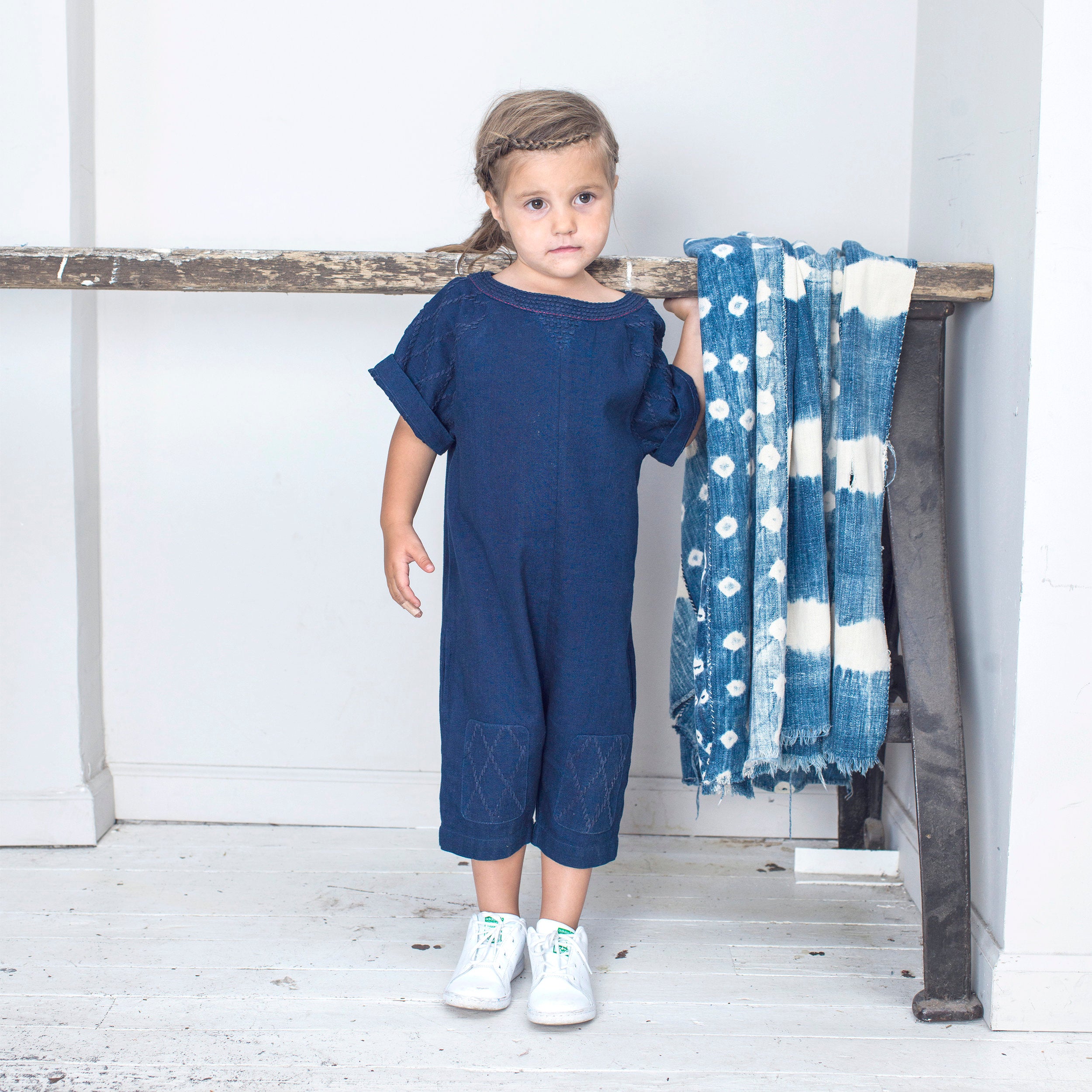 The Luca Romper's silhouette was inspired by Classic American Sweatshirt details. Its featured here cut in a drapey indigo basketweave. Our Chunky Diamond Sashiko stitch covers the sleeves and knee patches, and the neckline pops with a heavy trapunto stitch and our signature red topstitch. Pockets at side seams for storing toys, sticks, and rocks. Button closure at back neck.