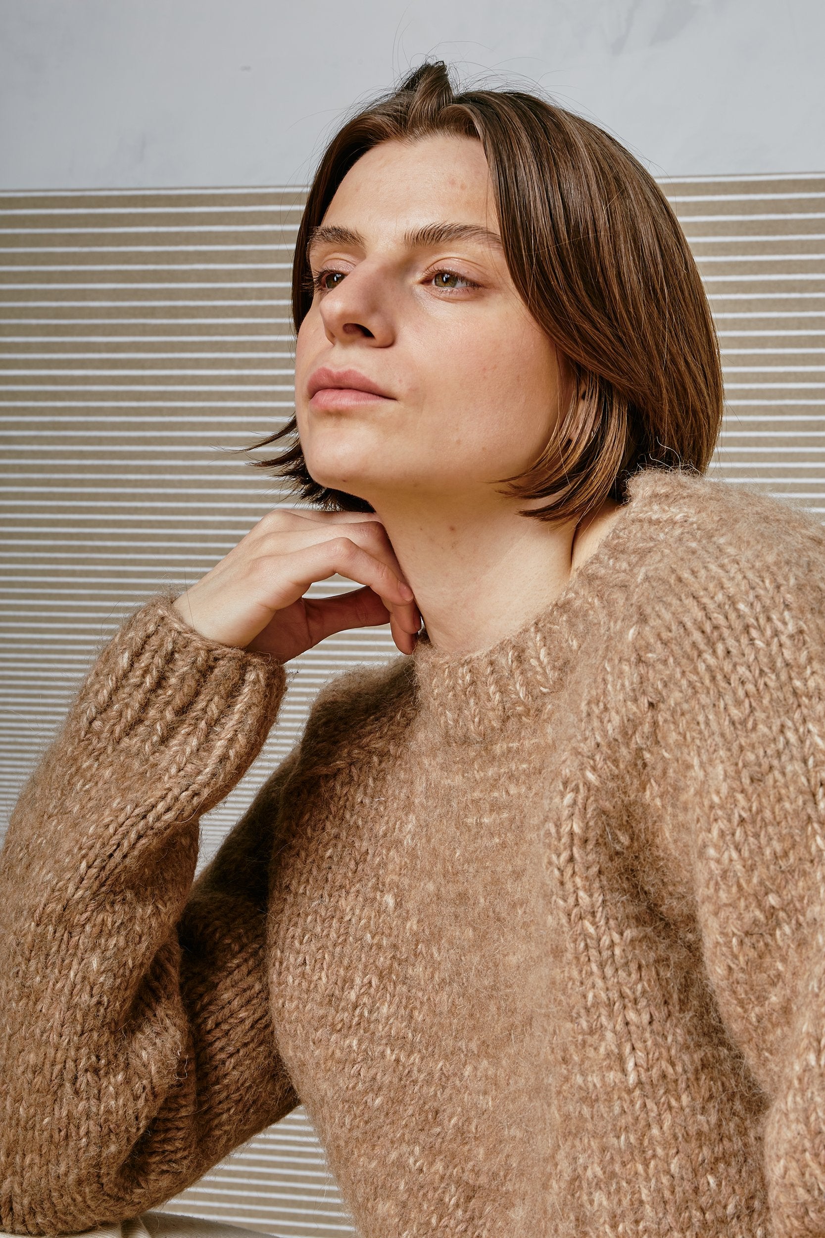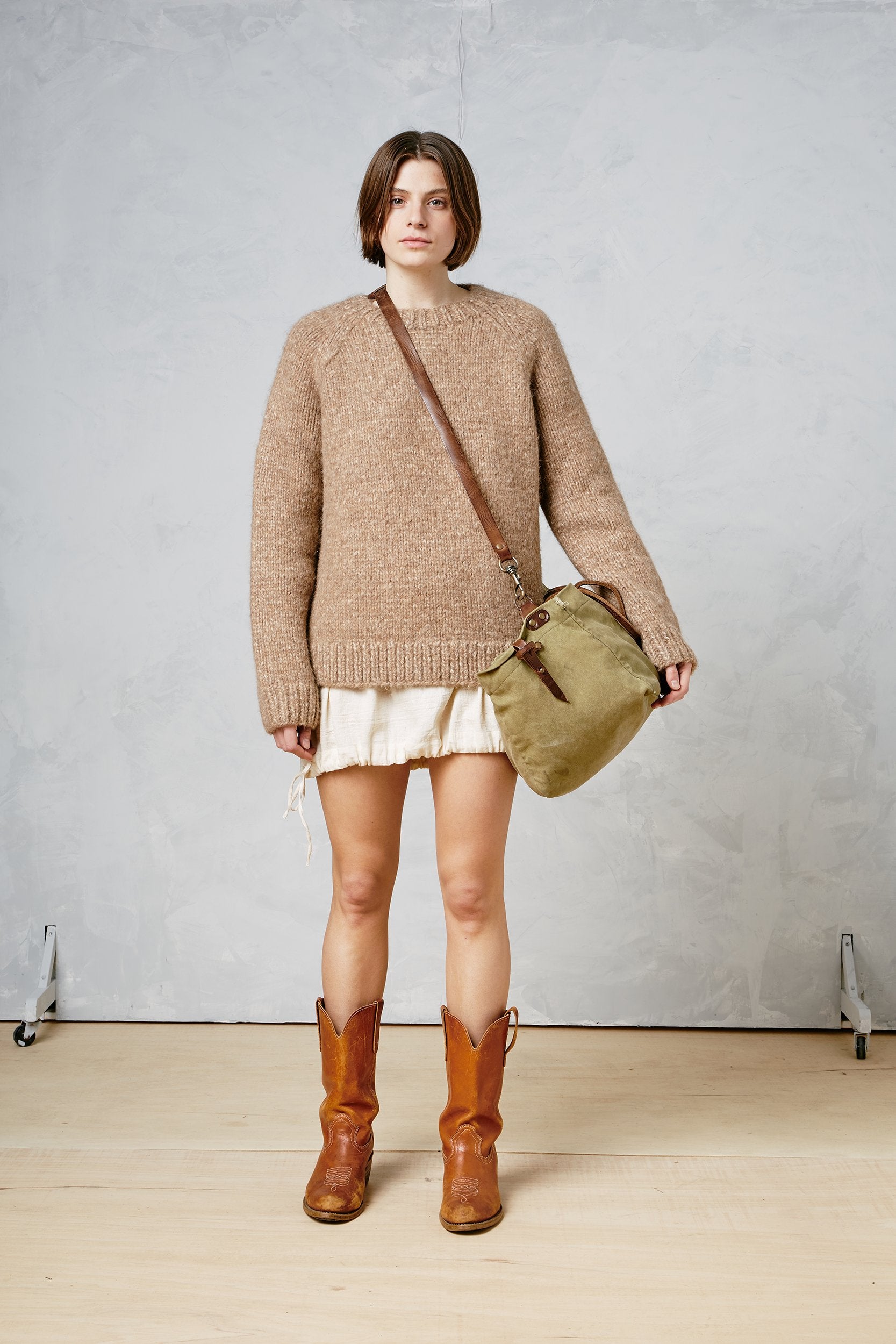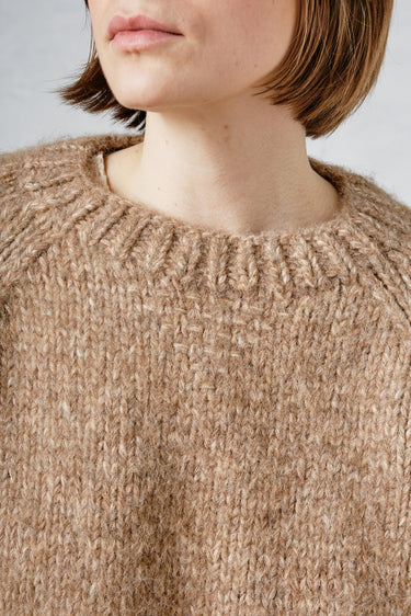 We've re-imagined the Nova this season in a heavy blend of eco alpaca and organic cotton. We've run one yarn of undyded alpaca with two yarns of naturally dyed cotton simultaneously. In this case a tan alpaca yarn is run with a Molle tree bark dyed cotton yarn.