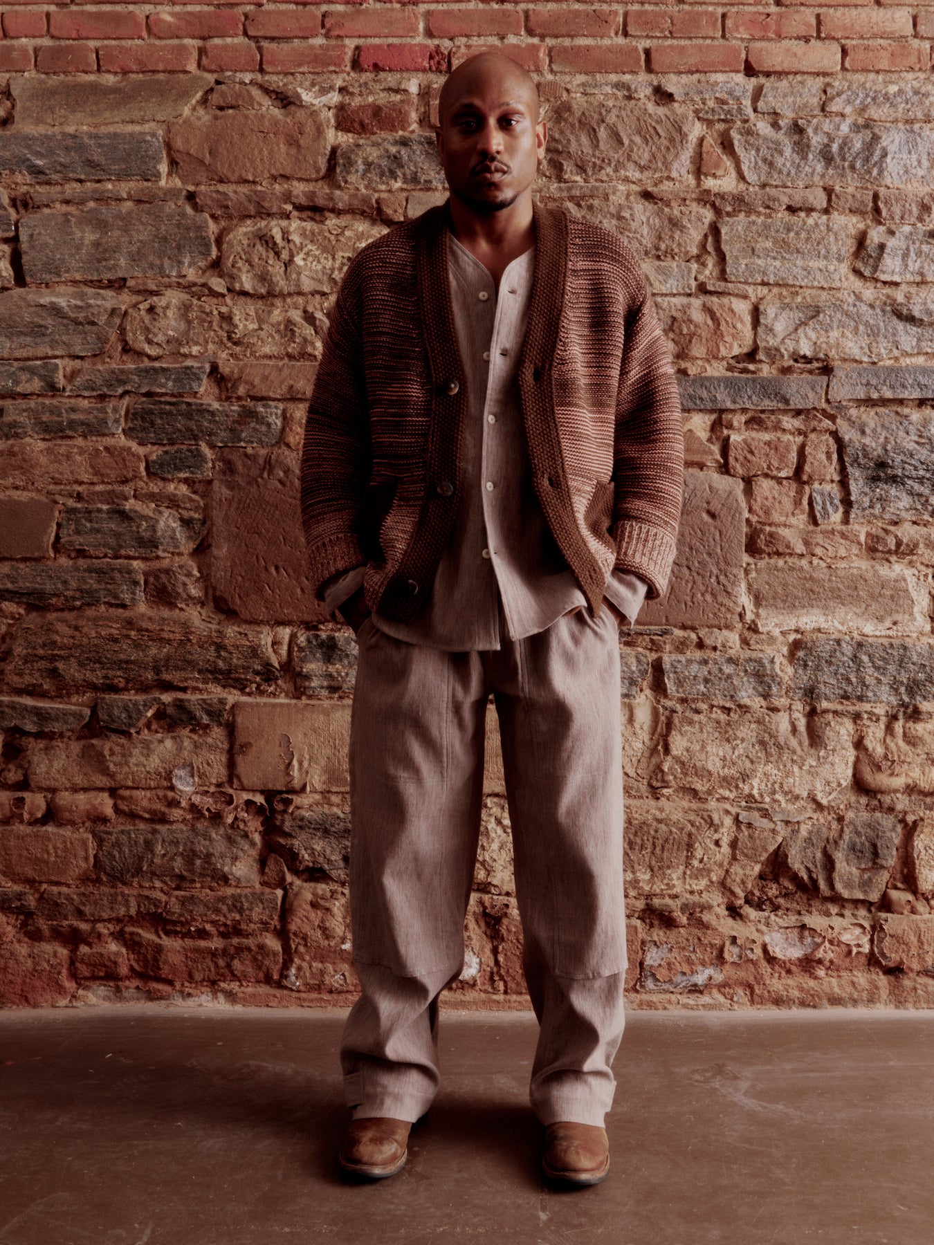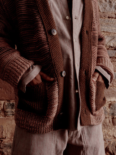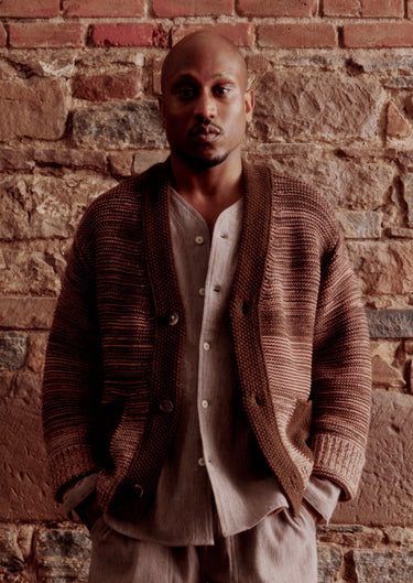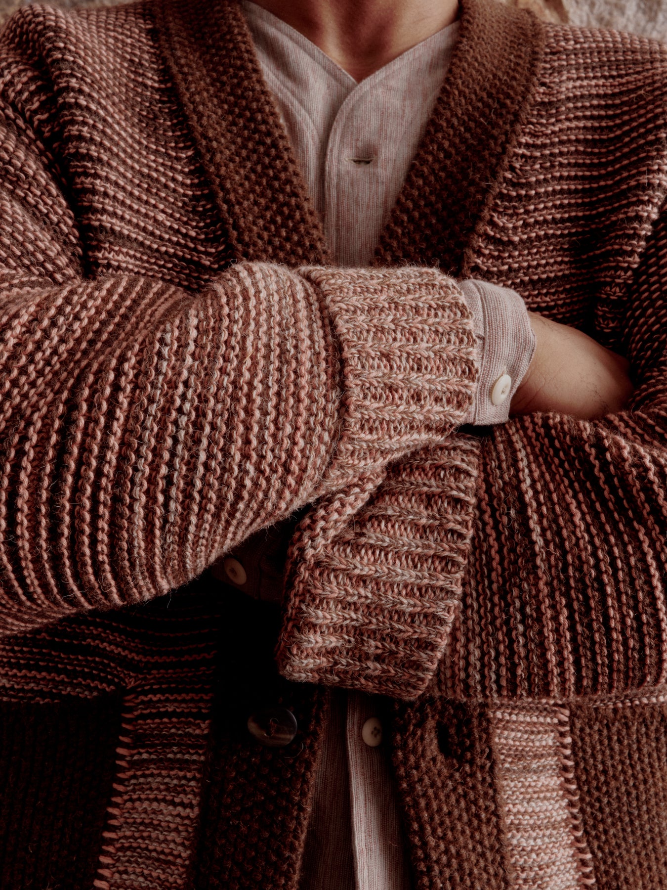 The Ren Cardigan takes heavy inspiration from antique Japanese sakiori hanten: farmers vests made from fabric rewoven from the cut strips of worn, no longer usable textiles.