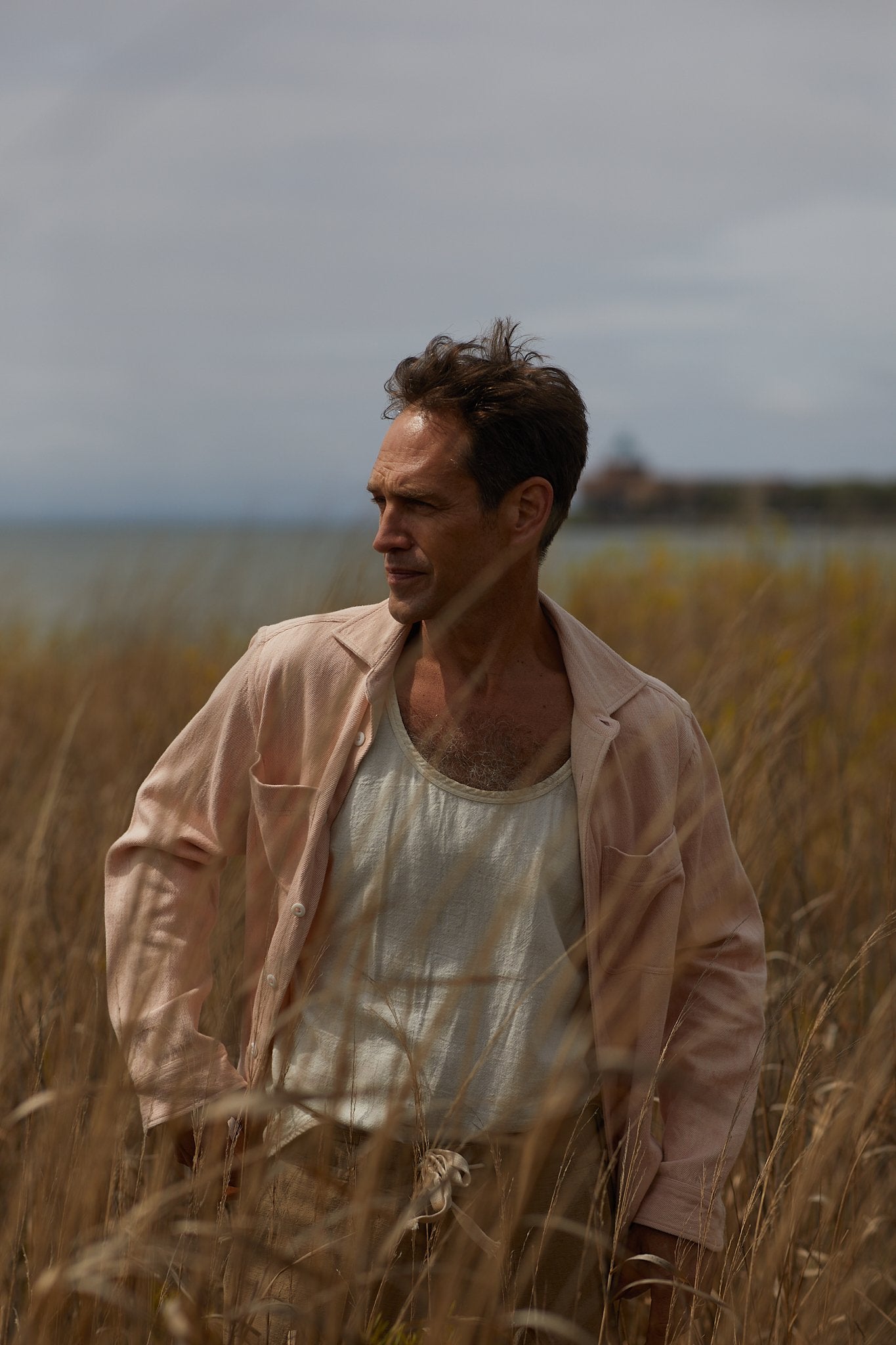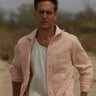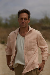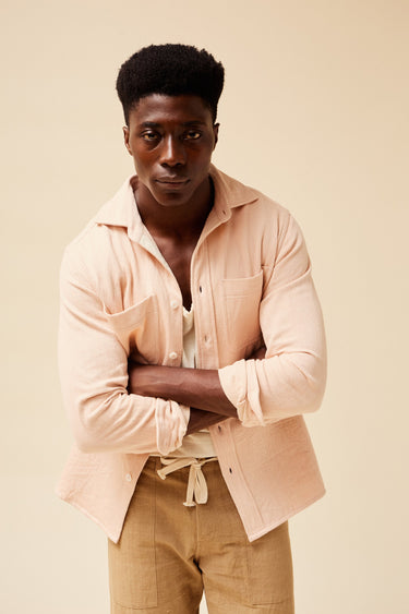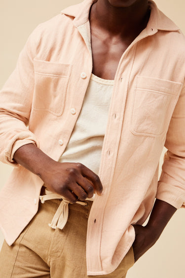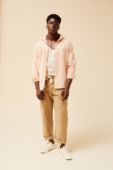 Our classic Ames Workshirt. Denim powerloomed for increased density while maintaining a beautiful drape. Introduced this spring in a gentle soft Indian Madder Root pink weft and natural warp.