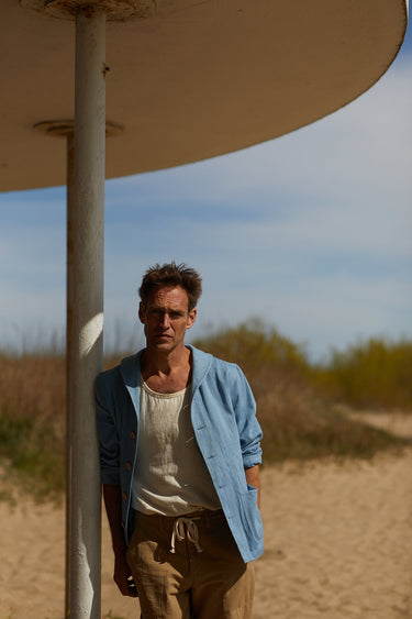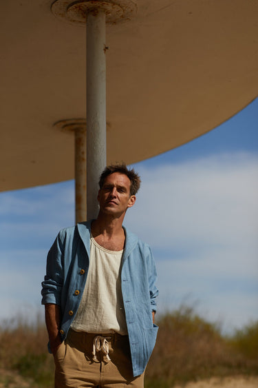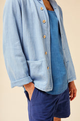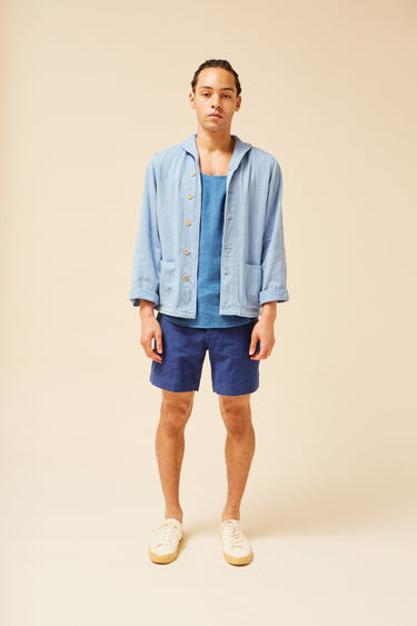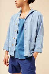 Our Ernest Jacket is. a new style inspired by early issue USN Deck Jackets. We appreciate it for its simplicity. Form and function pared down to clean necessity. A stiff shawl collar contrasts with our drapey light weight handwoven denim. A plant based indigo weft crosses with a natural warp to create a beautiful shade of sky blue.