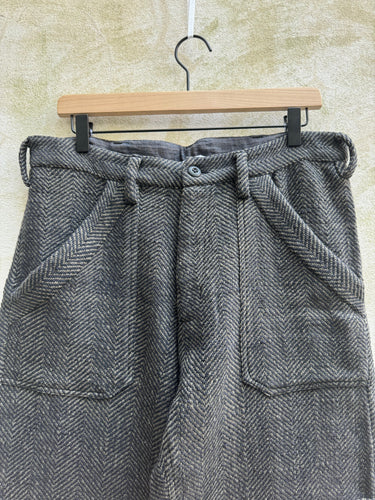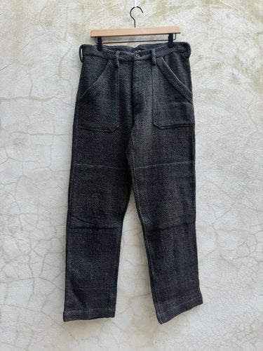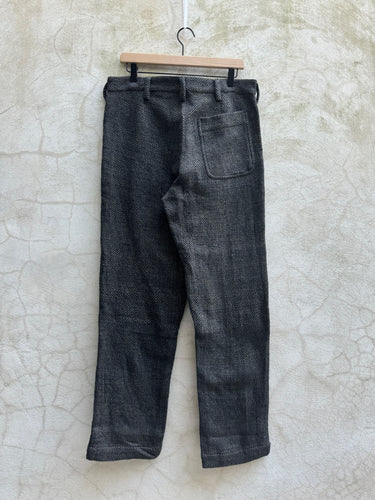 The fabric is truly special. handwoven from Handspun yarns in a broad herringbone, this one is all texture. Diluted iron dyed yarns in the warp are crossed with iron black yarns in the weft that have been dyed with recycled metals and sugar.