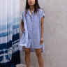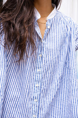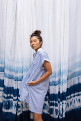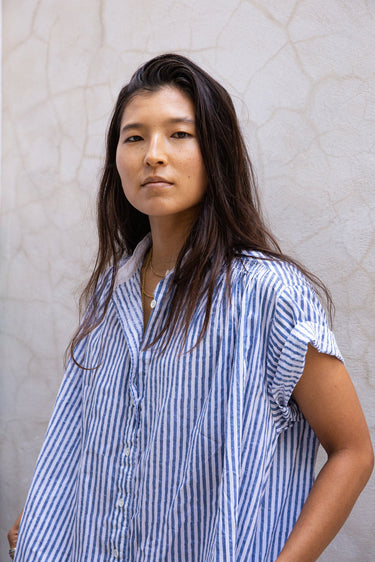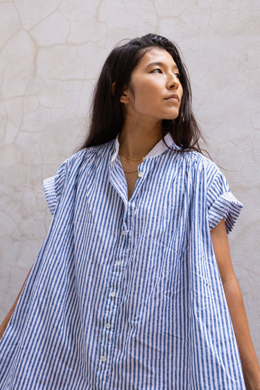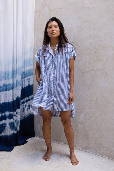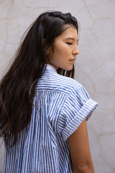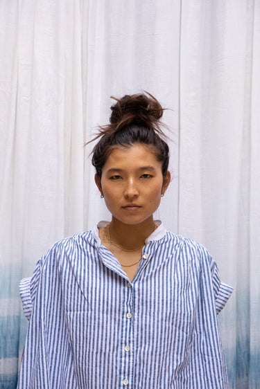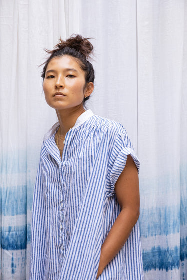 The Jamie is a short sleeve button through tunic. Here it is in our handwoven oxford, block printed with bengal stripes with plant based indigo. Beautifully smocked at the front and back yoke with an excellent drape. A flattering loose, straight cut. Contrast white oxford band collar. Mother of Pearl buttons.